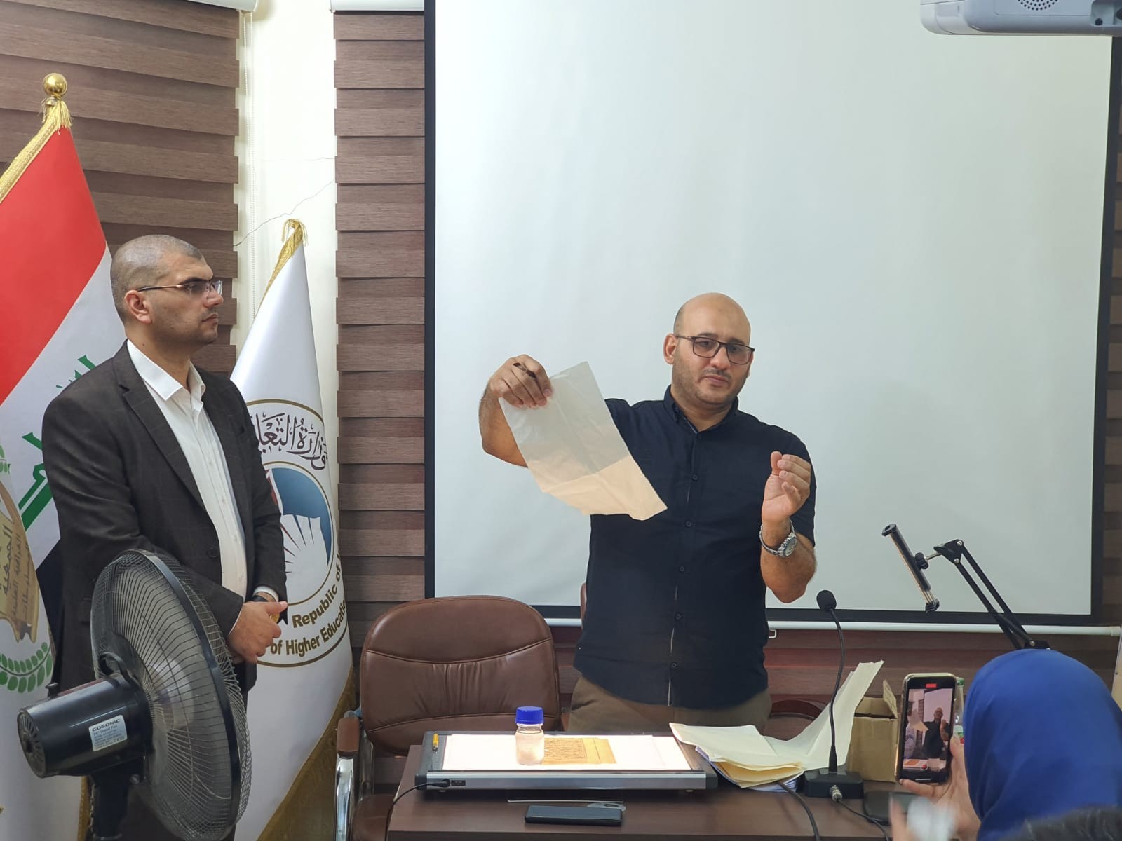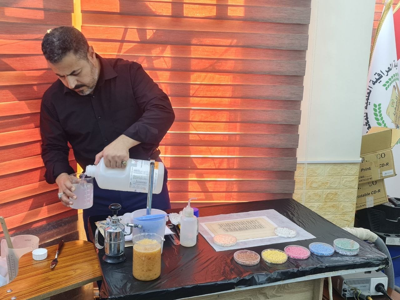 وأضاف الجبوري:" كما تم تبيان شرح مفصل كيف يتم إدخال المخطوطة الى مرحلة الترميم والتي تكون بطريقتين: الطريقة الأولى هي الطريقة الجافة باستخدام الورق الياباني، والطريقة الثانية هي الطريقة الرطبة باستخدام عجينة الورق، وتستخدم الطريقة المناسبة حسب حساسية الورق ".