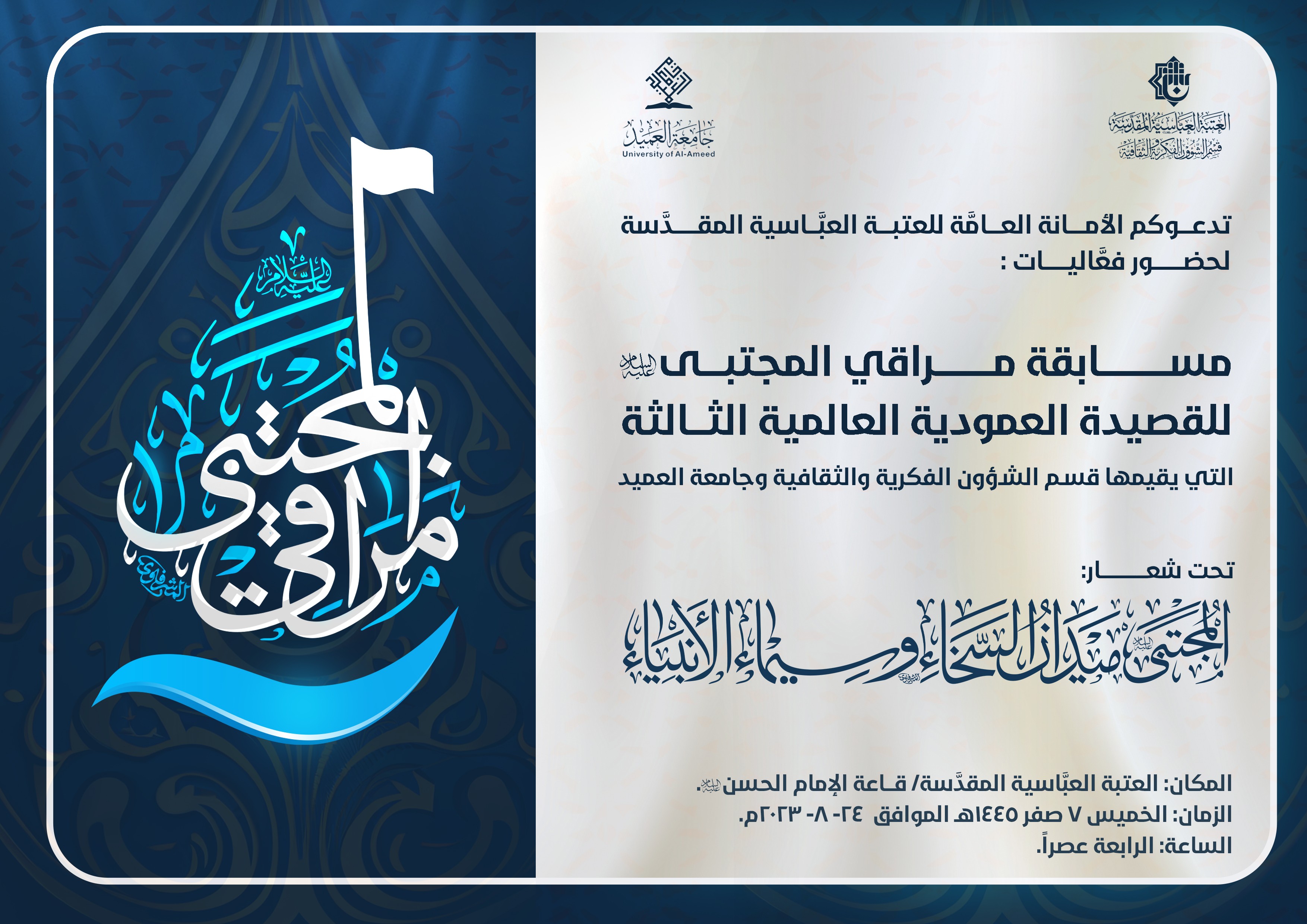 تدعو الأمانة العامّة للعتبة العبّاسيّة المقدسة الأدباء والأكاديميين والمهتمين بالشأن الأدبي لحضور فعاليّات مسابقة مراقي المجتبى (عليه السلام) للقصيدة العموديّة العالميّة الثالثة تحت شعار: (المجتبى عليه السلام ميدان السخاء وسيماء الأنبياء)، والتي يقيمها قسم الشؤون الفكريّة والثقافيّة وجامعة العميد.