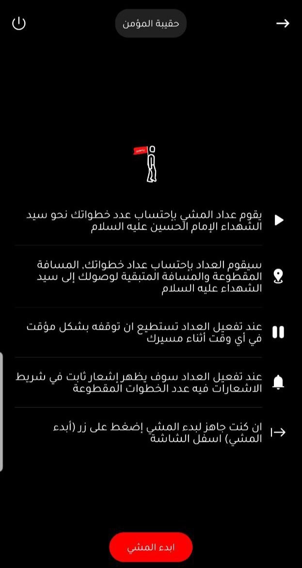 قدّم مركز التطبيقات البرمجيّة التابع لقسم الشؤون الفكريّة والثقافيّة في العتبة العبّاسيّة المقدّسة خدمة عدّاد المشي الخاص بالزيارة الأربعينيّة من خلال تطبيق حقيبة المؤمن، والتي تُمكِّن الزائر الكريم من احتساب عدد خطوات المسافة المقطوعة والمسافة المتبقّية لوصوله الى سيّد الشهداء (عليه السلام).