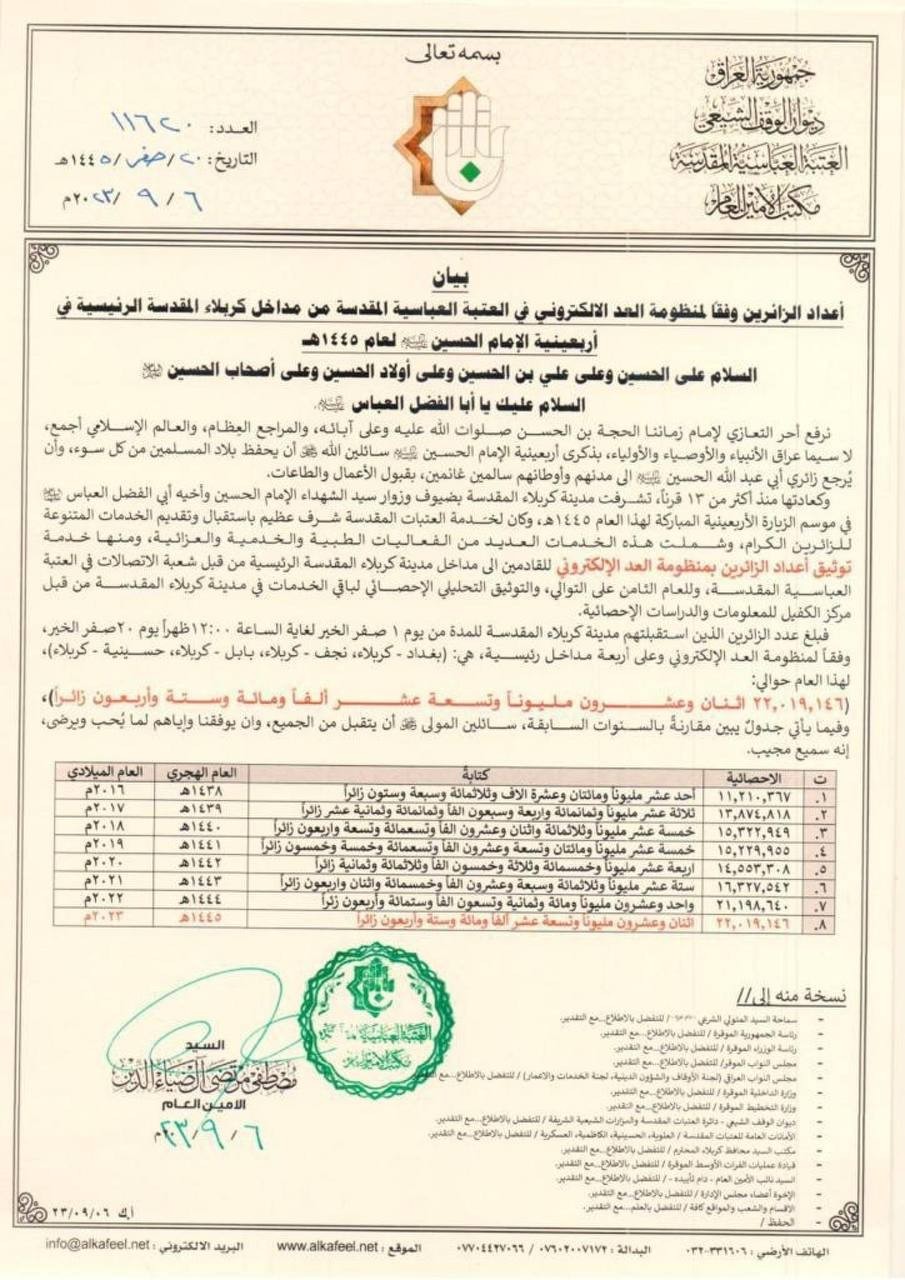 ومن الجدير بالذكر أنّ الاحصائيات صدرت ببيان رسمي عن العتبة العبّاسيّة المقدّسة يحتوي على جميع التفاصيل معتمدة على منظومة العد الإلكتروني الخاصّة بها.