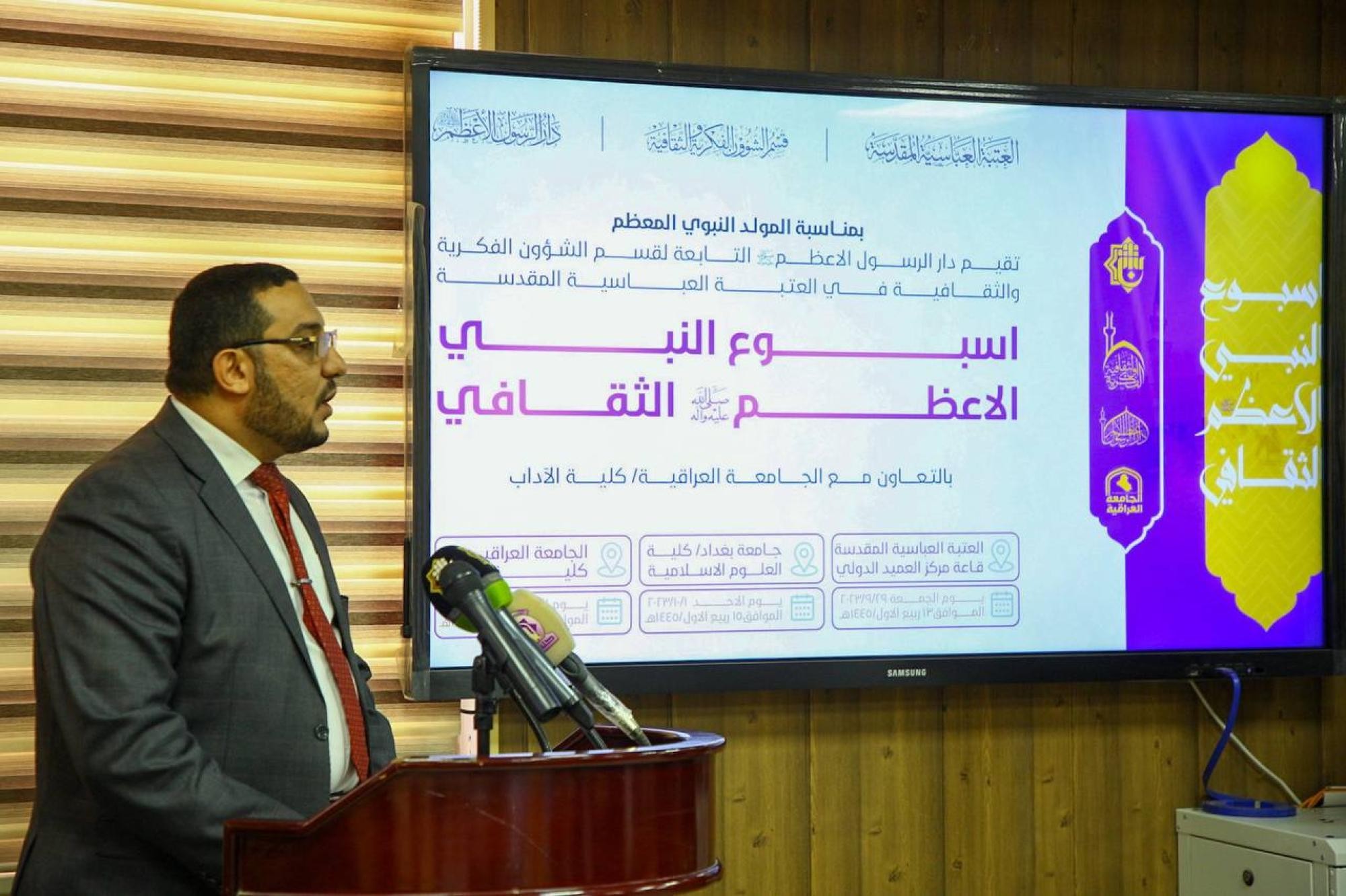 وقال الدكتور داوود سلمان الزبيدي بكلمة العتبة العبّاسيّة المقدّسة خلال الحفل المركزي الذي أُقِيم في كلية الآداب بالجامعة العراقية، ضمن فعّاليّات أسبوع النبي الأعظم (صلى الله عليه وآله) الثقافي الذي تقيمه العتبة العبّاسيّة المقدّسة: "نقدّم أجمل التهاني والتبريكات لكم وللأمّة الإسلاميّة والإنسانيّة جمعاء بولادة النبي الخاتم محمد (صلى الله عليه وآله) الذي نحمد الله تعالى أن منّ علينا به دون الأمم الماضية والقرون السالفة، نبي الرحمة، وقائد الخير ومفتاح البركة، النبي الأمين الذي نصّب نفسه لأمر ربه، وعرّض فيه للمكروه بدنه، وحارب في رضاه أسرته، وقطع في إحياء دينه رحمه".