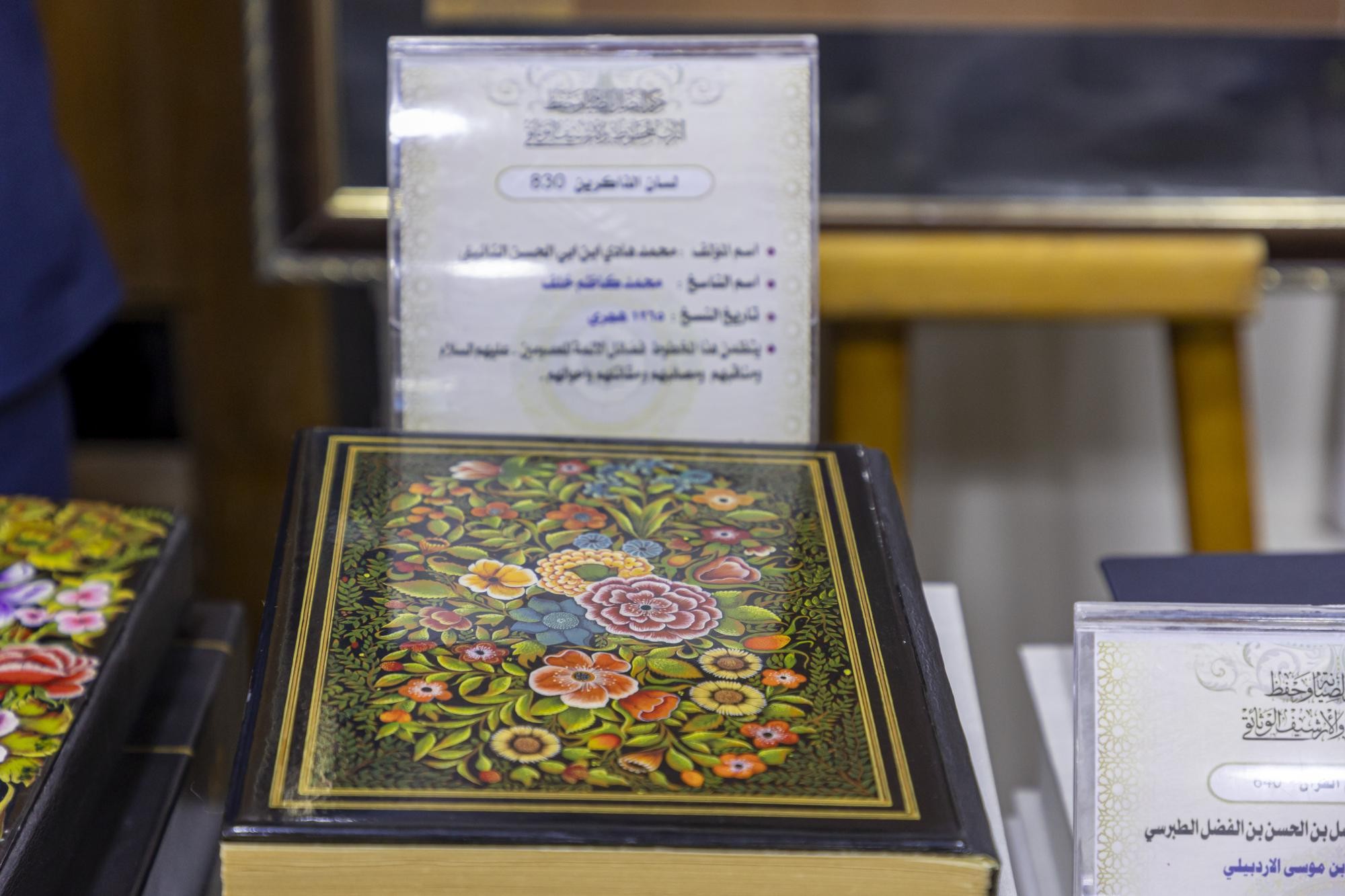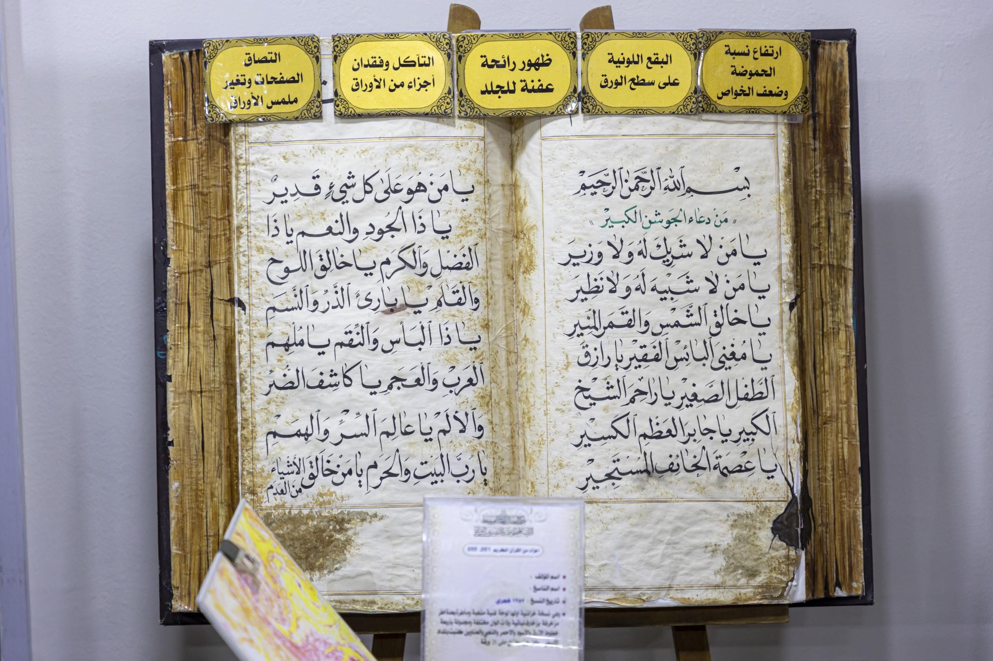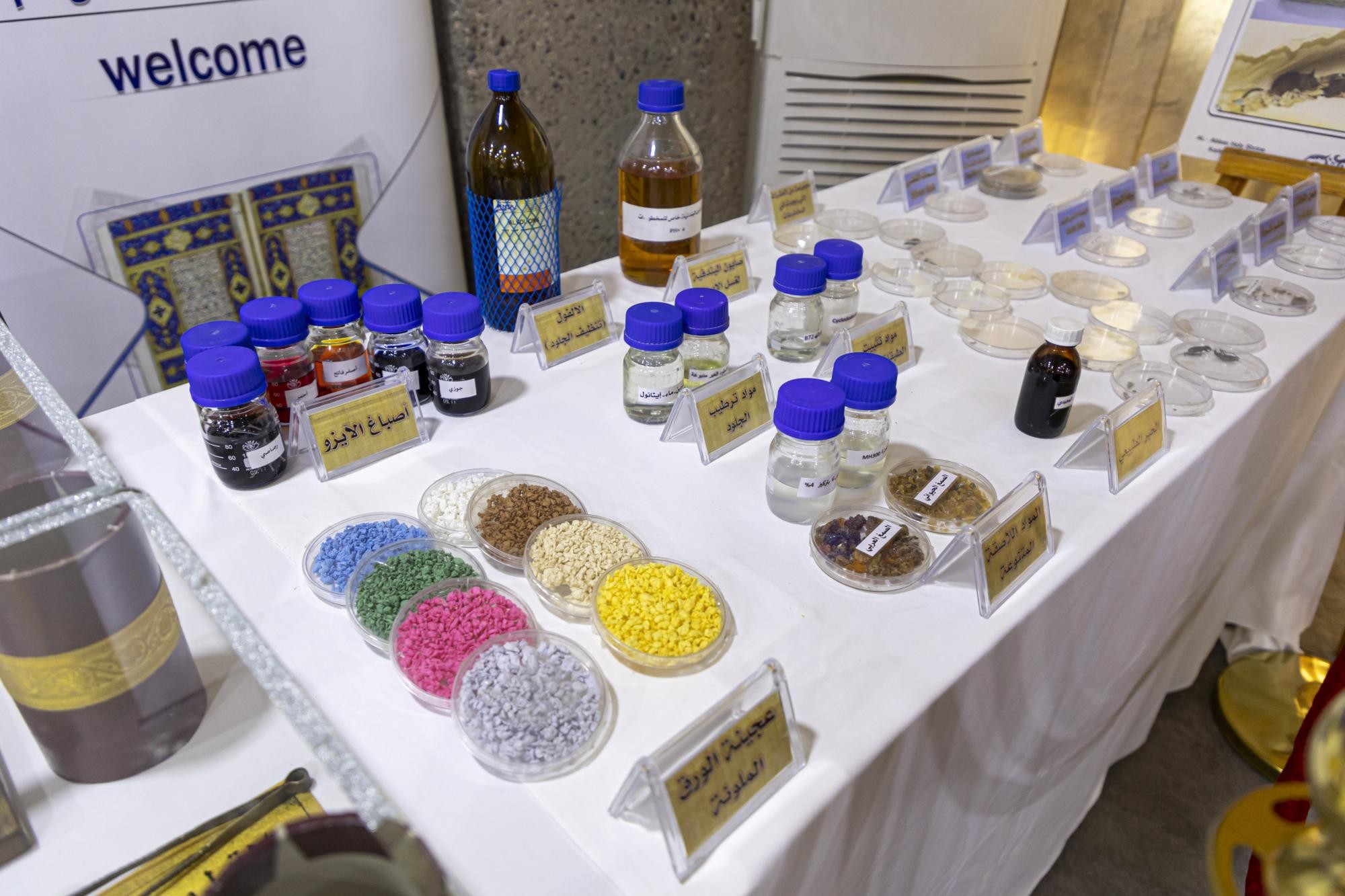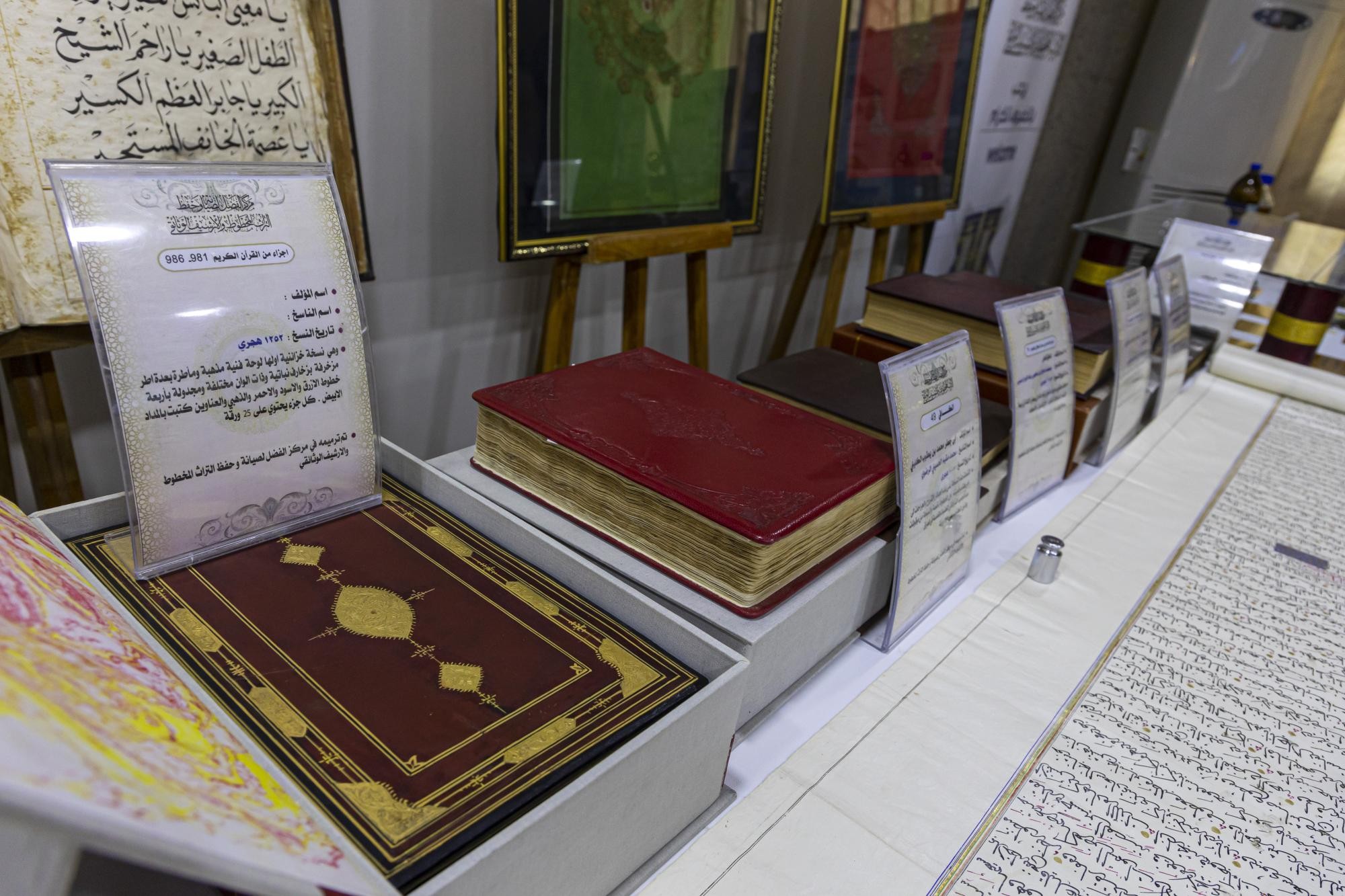 وأضاف أنّ "المعروضات تمثّلت بعدد من المخطوطات المرمّمة والأغلفة المزخرفة التي صُنِعت داخل المركز، فضلًا عن لوحات فنية، وبعض المقتنيات النادرة مثل أدوات الكتابة المستخدمة قديمًا".