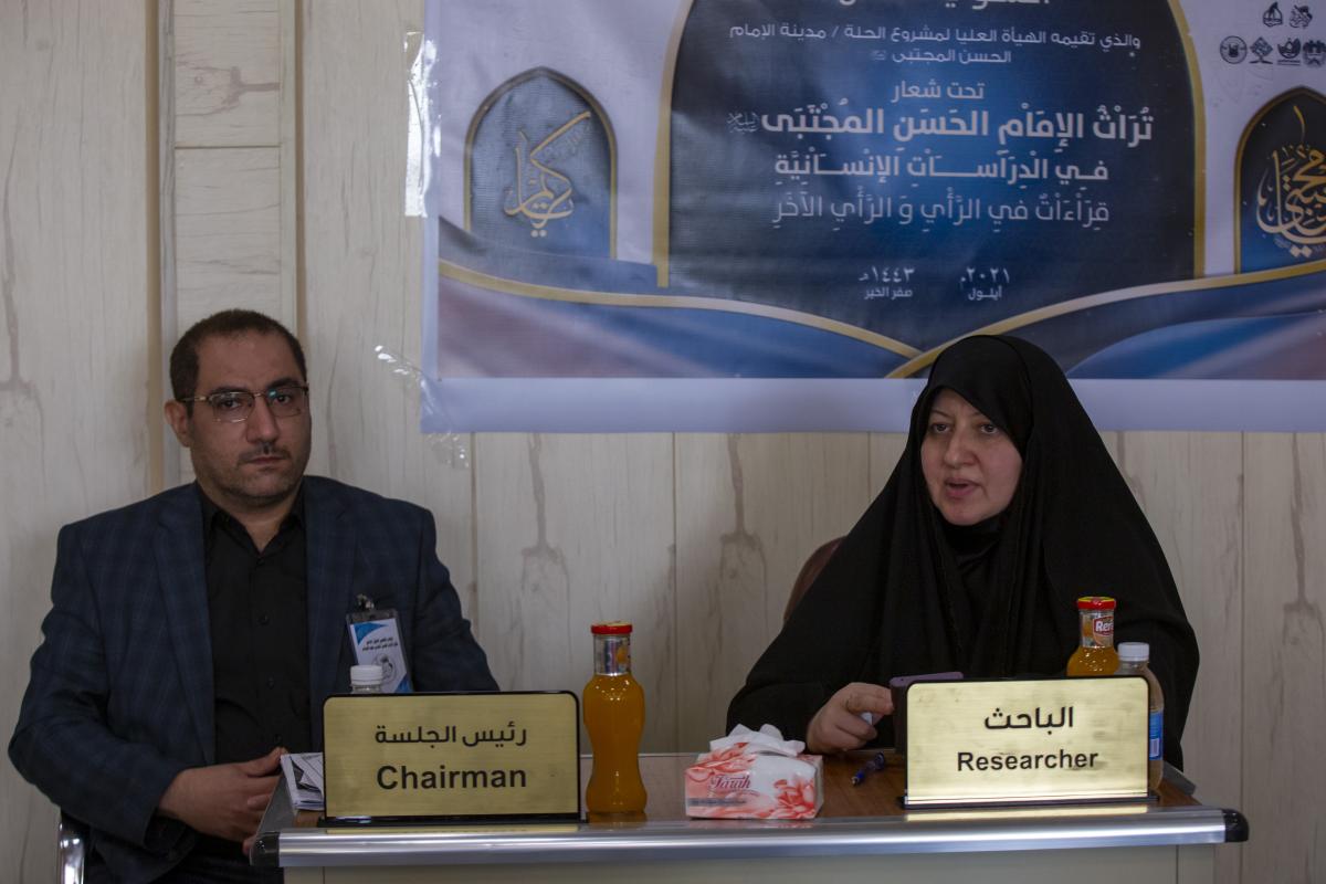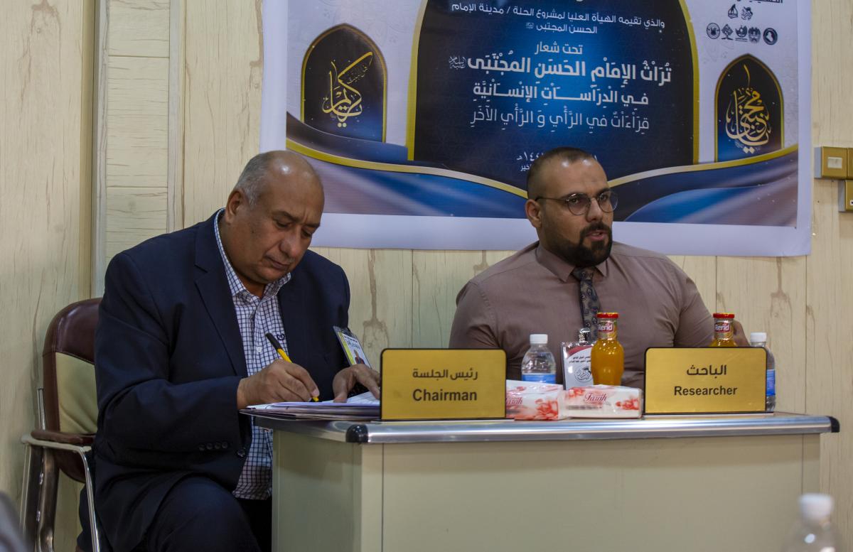 بعد ذلك أُلقي بحث الافتتاح للأستاذ الدكتور "عباس علي حسين الفحام" من جامعة الكوفة/كلية التربية للبنات، وكان بعنوان (الإمام الحسن (عليه السلام) ادب السيرة والخطاب).