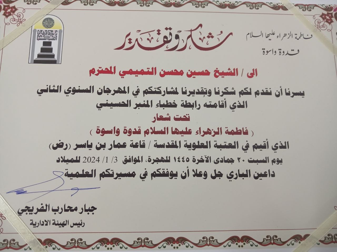 يُذكر أنّ هذا المهرجان الذي تقيمه -سنوياً- رابطة خطباء المنبر الحسيني (منظمة غير حكومية) عُقد بعنوان: (الصديقة الزهراء عليها السلام أُسوة وقدوة)، وذلك بتاريخ: (20 جمادى الآخرة 1445هـ، الموافق ٣/ ١/ ٢٠٢٤م) في قاعة عمار بن ياسر رضوان الله عليه في العتبة العلوية المقدسة، وقد خُتم بتكريم الباحثين مع تقديم شهادات المشاركة والشكر والتقدير.