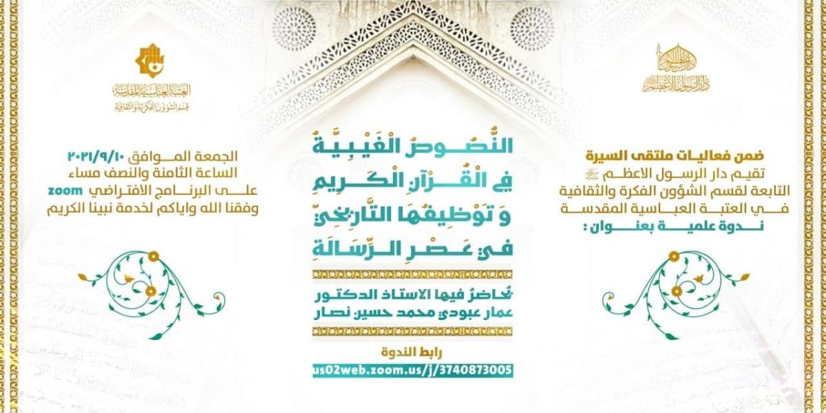 أعلنت دارُ الرسول الأعظم(صلّى الله عليه وآله) عن التفاصيل الخاصّة بالندوة العلميّة الإلكترونيّة، المُعلَنِ عنها سابقاً تحت عنوان: (النصوص الغيبيّة في القرآن الكريم وتوظيفها التاريخيّ في عصر الرّسالة)، التي ستُقام مساء اليوم الجمعة في تمام الساعة الثامنة والنصف.