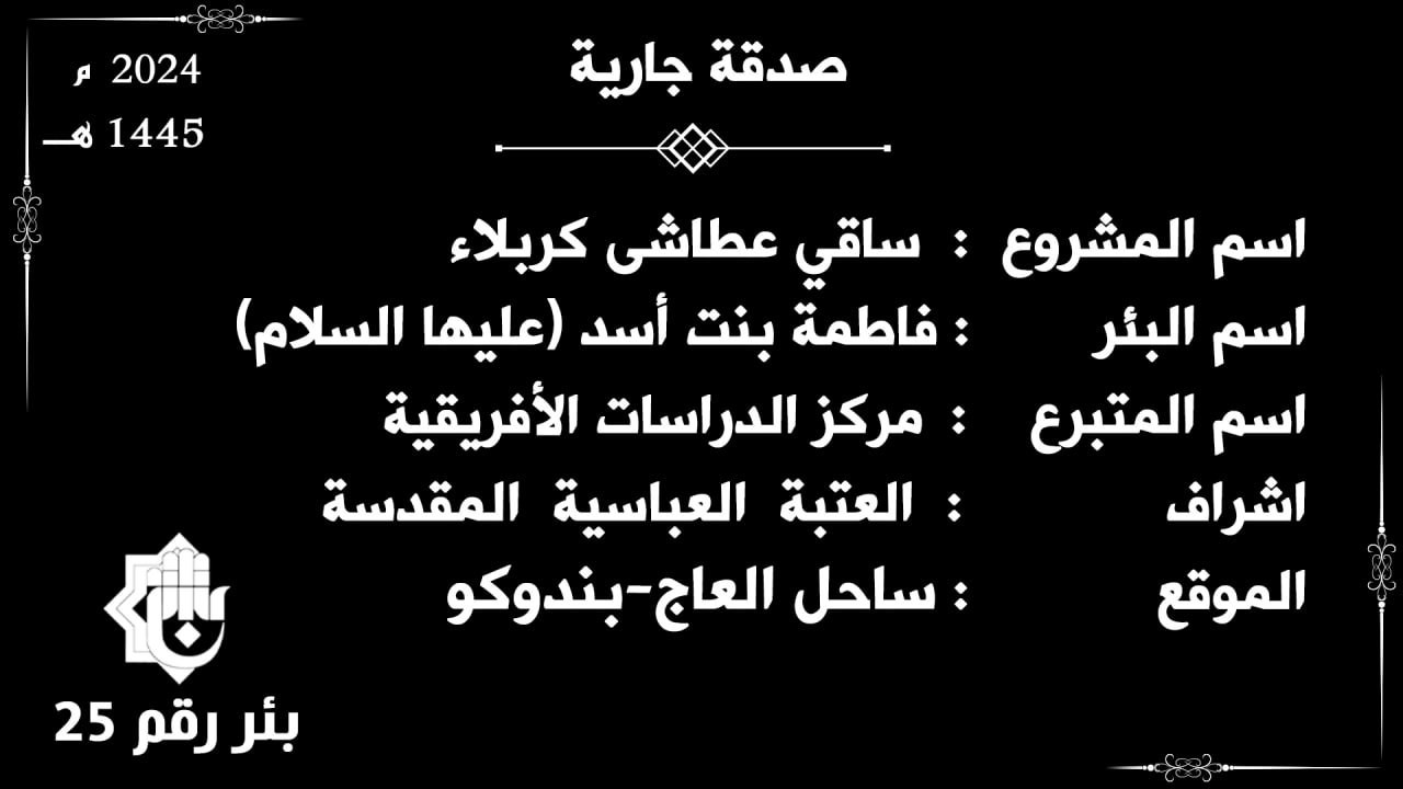 وقال مدير المركز الشيخ سعد الشمري: "إنّ افتتاح هذه البئر التي تحمل رقم (25) في دولة ساحل العاج بمدينة بندوكو، هو الأول لهذا العام وسمي بالسيدة فاطمة بنت أسد أم أمير المؤمنين (عليهما السلام).