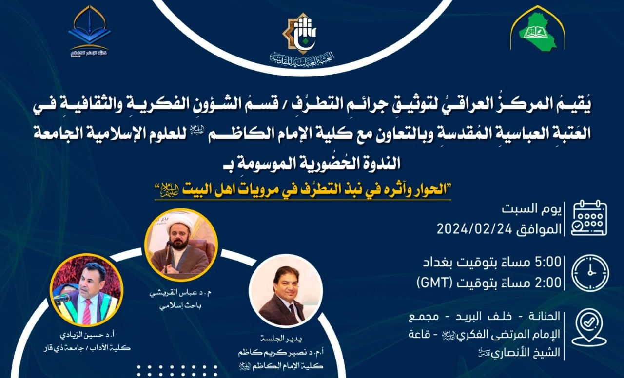 أعلن قسم الشؤون الفكريّة والثقافيّة في العتبة العبّاسيّة المقدّسة، عن إقامة ندوة حضوريّة تحت عنوان: "الحوار وأثره في نبذ التطرف في مرويات أهل البيت (عليهم السلام)" بالتعاون مع كلية الإمام الكاظم (عليه السلام) للعلوم الإسلاميّة.