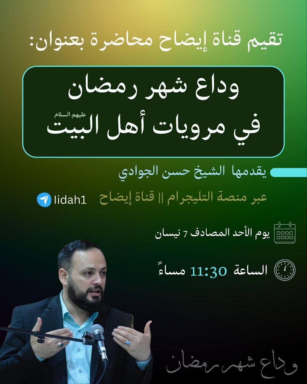 قدم مركز الدراسات والمراجعة العلمية التابع لقسم الشؤون الفكرية والثقافية في العتبة العباسية المقدسة محاضرة ثقافية وسمت بعنوان: 'وداع شهر رمضان في روايات أهل البيت عليهم السلام' على قناة إيضاح الإلكترونية.
