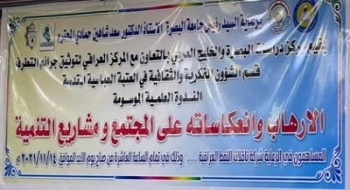 ظَّمَ المركزُ العراقيُّ لتوثيقِ جرائمَ التطرّفِ التابعُ لقسمِ الشؤونِ الفكريَّةِ والثقافيَّةِ في العتبةِ العبَّاسيَّةِ المُقَدَّسَةِ وبالتعاونِ مع مركزِ دراساتِ البصرَةِ والخليجِ العربي في جامعةِ البصرةِ ندوةً كانَتْ بعنوان (الإرهابُ وانعكاساتُه على المجتمعِ ومشاريعَ التنميةِ) .