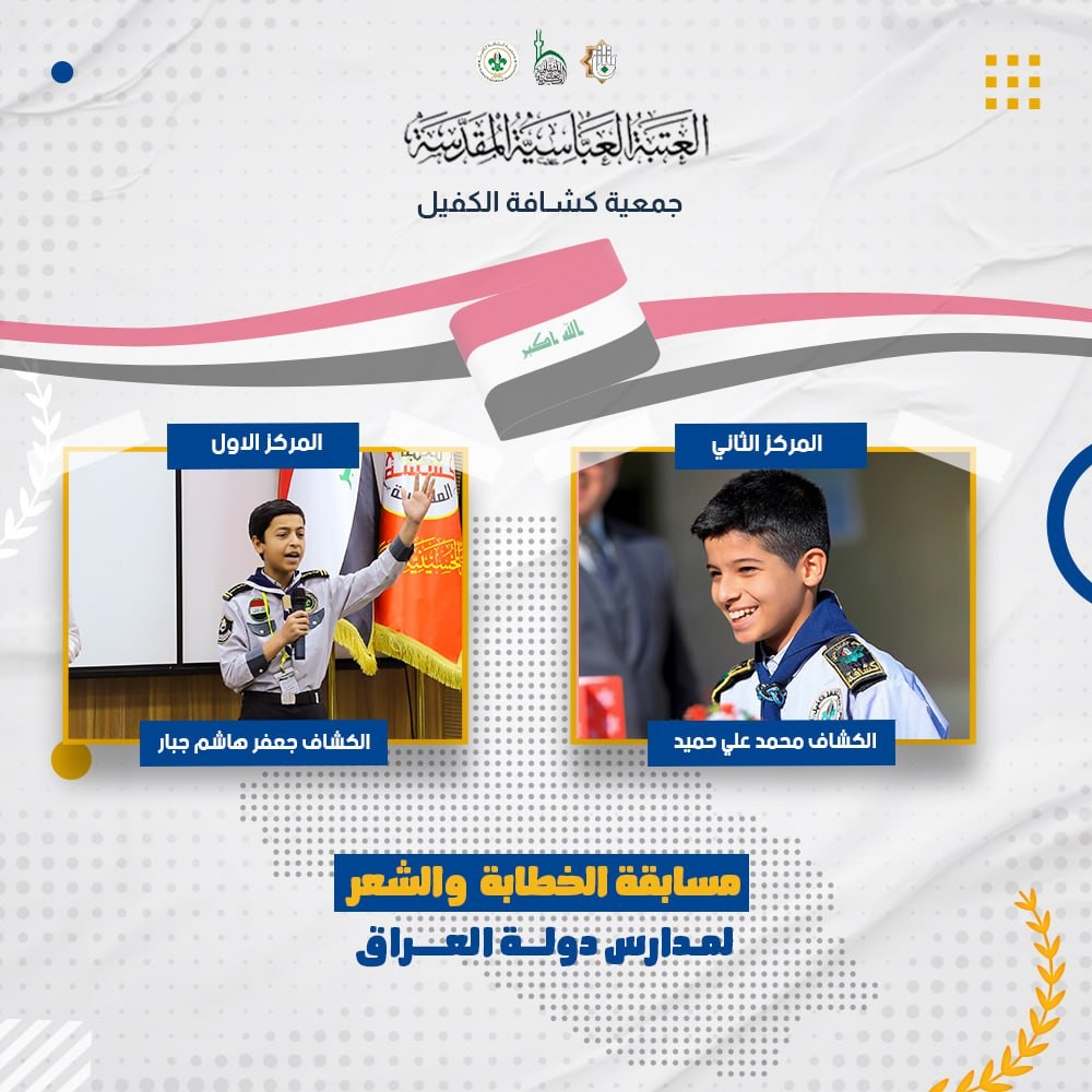 حصدت عناصر جمعيّة كشّافة الكفيل التابعة لقسم الشؤون الفكريّة والثقافيّة في العتبة العبّاسيّة المقدّسة مراكز متقدّمة في المسابقة الأدبيّة الطلابيّة الوزاريّة للشعر والخطابة التي نظّمتها مديريّة التربيّة في محافظة نينوى.