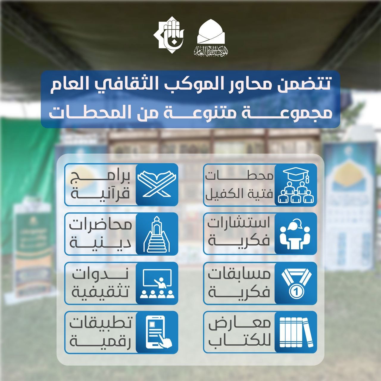 ويقام الموكب الثقافي العام على طريق الزائرين القادمين إلى مدينة كربلاء بثلاثة محاور رئيسية، وهي: محور (بغداد، النجف، وبابل).