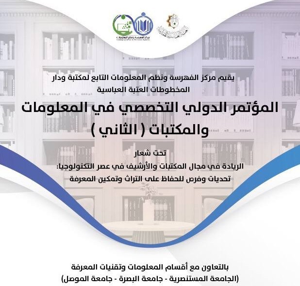 يدعو قسم الشؤون الفكرية والثقافية في العتبة العباسية المقدسة الباحثين والمهتمين لحضور فعاليات المؤتمر الدولي التخصّصي الثاني في المعلومات والمكتبات.