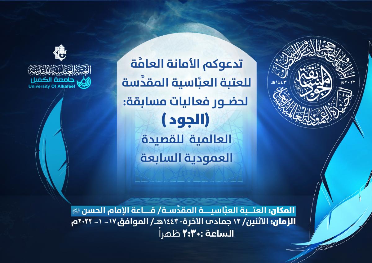 <p dir="RTL" style="margin-left:0in; margin-right:0in; text-align:right"><span style="font-size:11pt"><span style="font-family:Calibri,"sans-serif""><strong><span style="font-size:14.0pt"><span style="font-family:"Sakkal Majalla"">أعلنت اللّجنةُ التحضيريّةُ لمسابقة الجود العالميّة للقصيدة العموديّة، التي تنظّمها العتبةُ العبّاسية المقدّسة بدورتها السابعة، عن الانتهاء من جميع الاستعدادات الخاصّة بفعّالياتها، التي ستنطلق في رحاب صحن أبي الفضل العبّاس(عليه السلام) يوم الاثنين القادم (13 جمادى الآخرة 1443هـ) الموافق لـ(17 كانون الثاني 2022م)، تحت شعار: (أمّ البنين والقمر حِجْرُ الإيثار وسيّدُ الفضل)، وذلك تزامناً مع ذكرى رحيل سيّدة الوفاء أمّ البنين(عليها السلام).</span></span></strong></span></span></p>