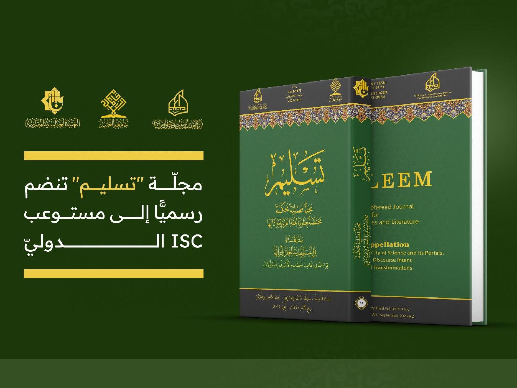 أعلنت جمعية العميد العلمية والفكرية انضمام مجلة تسليم المحكّمة إلى مستوعب مؤسّسة الاستشهاد المرجعي لعلوم العالم الإسلامي الدولي ISC.