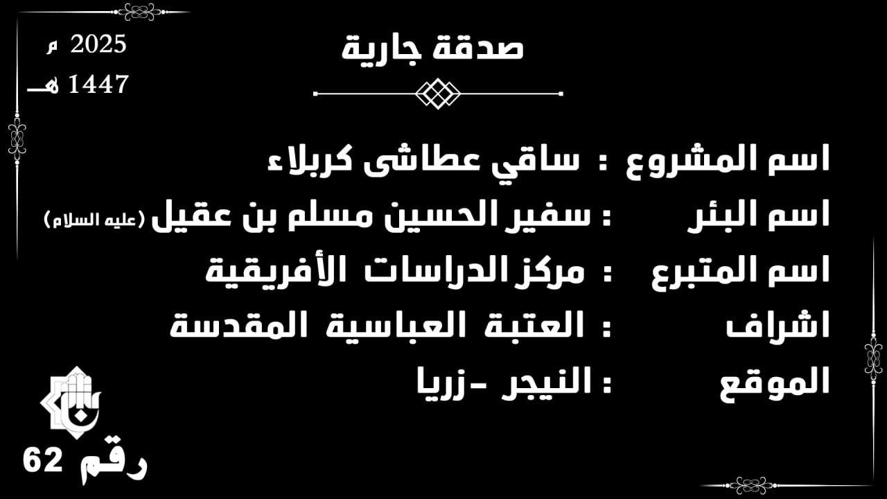 وتأتي البئر، التي أُطلق عليها اسم "سفير الإمام الحسين (عليه السلام) الصحابي مسلم بن عقيل (رضوان الله عليه)"، ضمن مشروع "ساقي عطاشا كربلاء"، الذي يشرف على تنفيذه مركز الدراسات الإفريقية التابع للقسم.