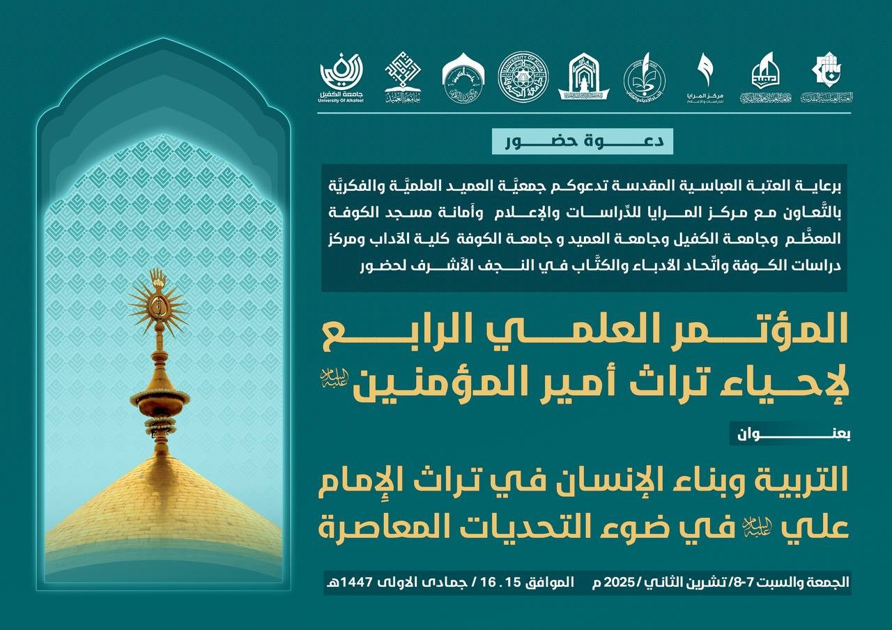 تدعو جمعيَّة العميد العلميَّة والفكريَّة الباحثين والمهمتين بالشأن العلمي والفكري، لحضور فعاليَّات المؤتمر العلمي الرابع لإحياء تُراث أمير المؤمنين (عليه السَّلام).