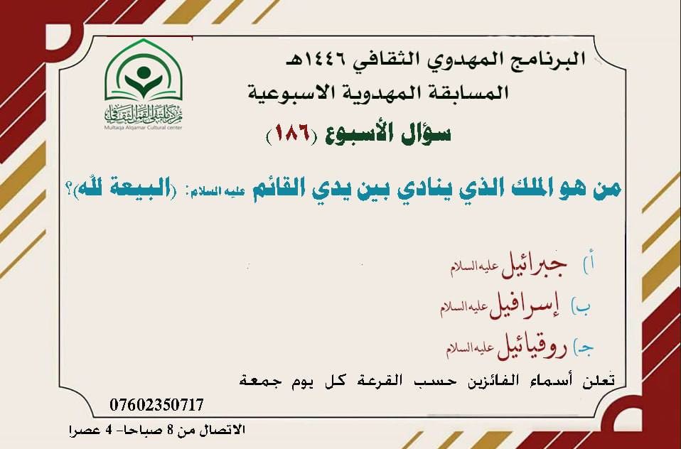 ينظّم قسمُ الشؤون الفكرية والثقافية في العتبة العباسية المقدسة، ممثّلًا بمركز ملتقى القمر الثقافي، المسابقةَ المهدويّة الأسبوعية التي تأتي ضمن برنامجه المهدوي الثقافي الهادف إلى تعزيز الوعي بالقضية المهدوية وترسيخ حضورها في وجدان المجتمع، لاسيّما فئة الشباب.