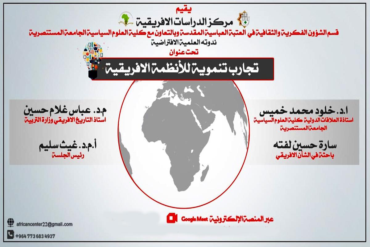 <p dir="RTL" style="margin-left:0in; margin-right:0in; text-align:right"><span style="font-size:11pt"><span style="font-family:Calibri,"sans-serif""><strong><span style="font-size:14.0pt"><span style="font-family:"Sakkal Majalla"">نظّمَ مركزُ الدّراسات الأفريقيّة التابع لقسم الشؤون الفكريّة والثقافيّة في العتبة العبّاسية المقدّسة، بالتعاون مع كلّية العلوم السياسيّة في الجامعة المستنصريّة، ندوةً علميّةً افتراضيّة تخصّصية تحت عنوان: (تجارب تنمويّة للأنظمة الأفريقيّة).</span></span></strong></span></span></p>