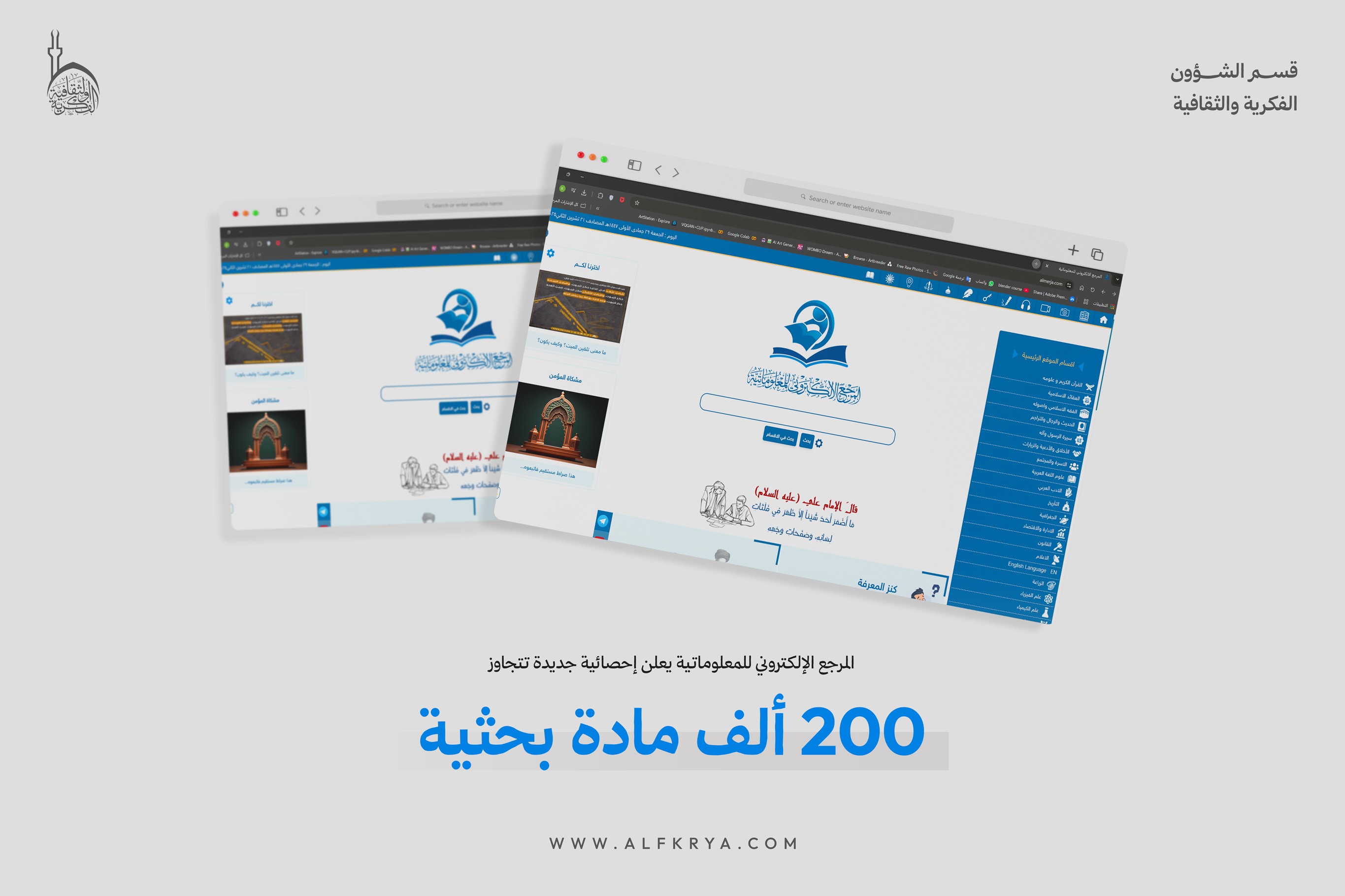 أعلن مركز المرجع الإلكتروني للمعلوماتيّة التابع لقسم الشؤون الفكريّة والثقافية في العتبة العبّاسيّة المقدسة عن تخطي عدد المقالات البحثية المنشورة على موقعه أكثر من 200 ألف مقال.