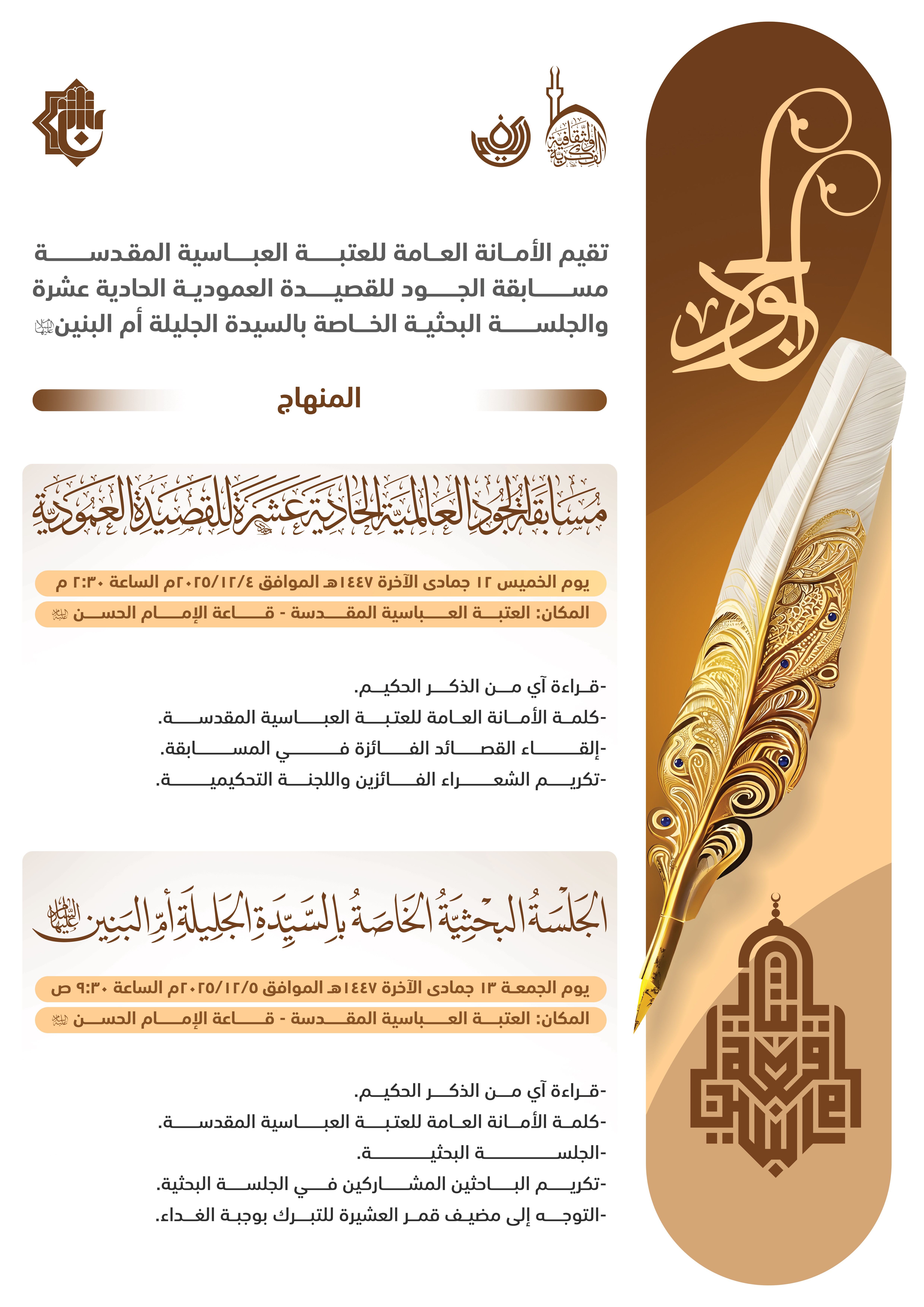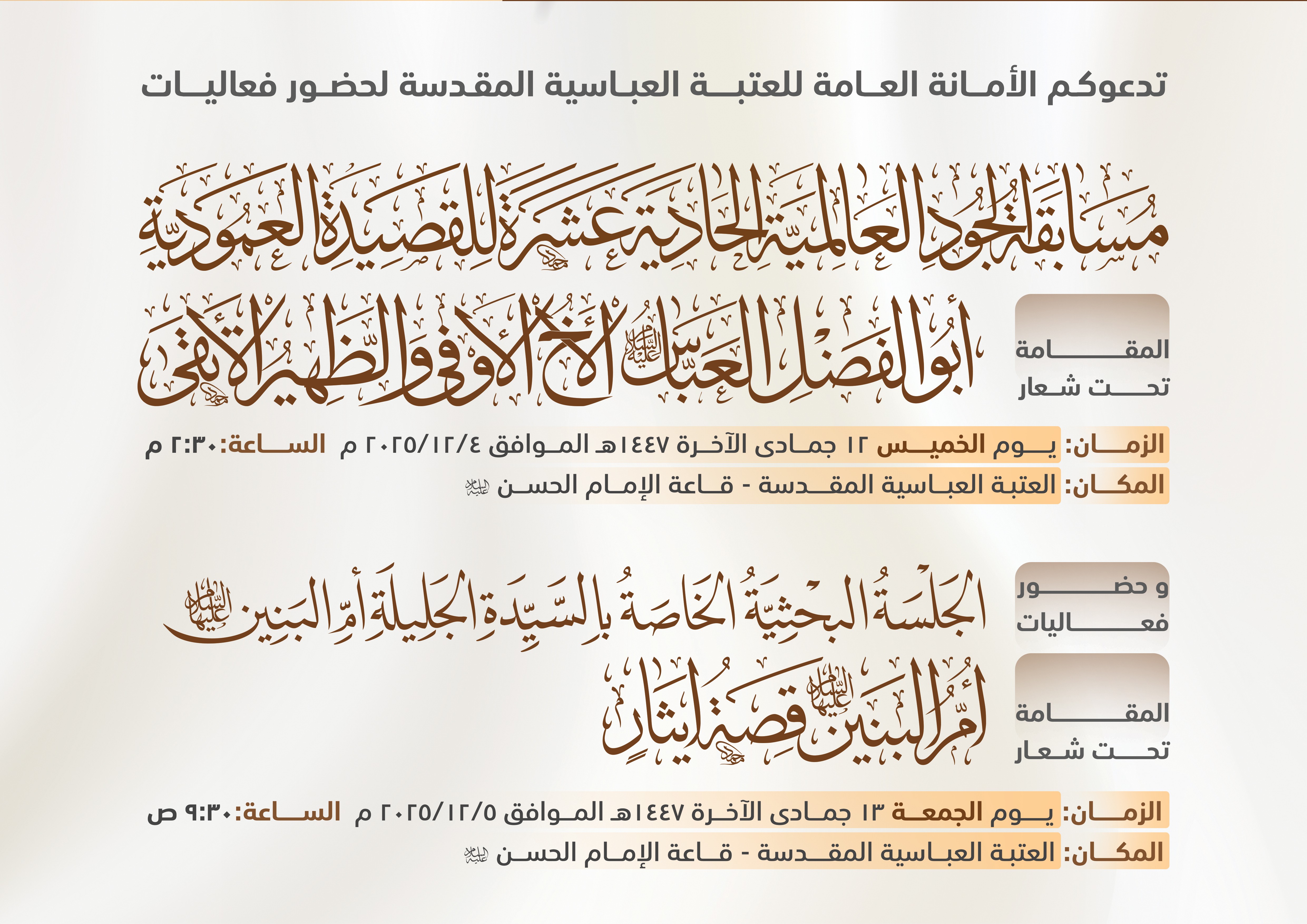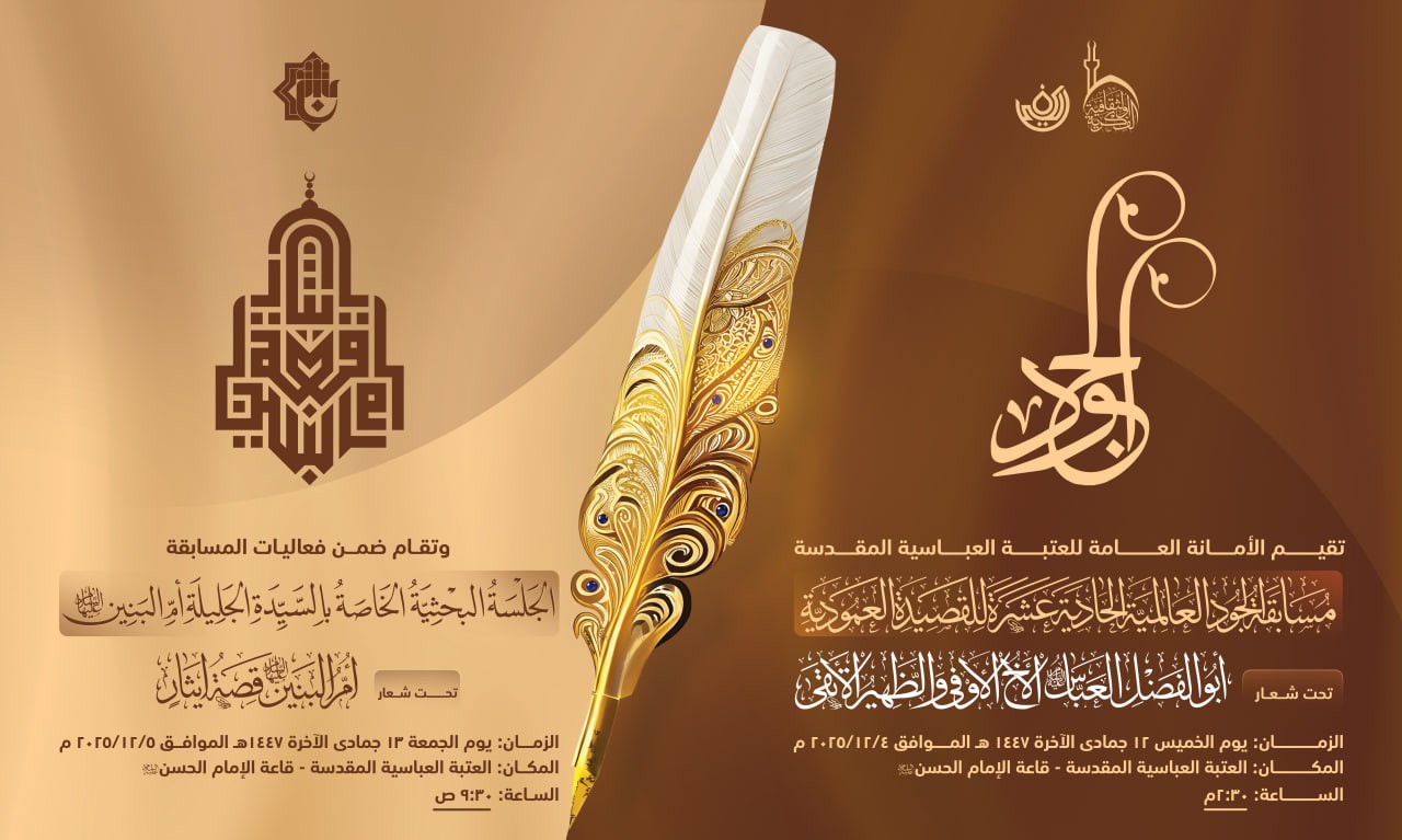 العتبة العبّاسية المقدّسة تدعو الباحثين والمهتمّين إلى حضور فعاليات النسخة الحادية عشرة من مسابقة الجود العالمية للقصيدة العمودية