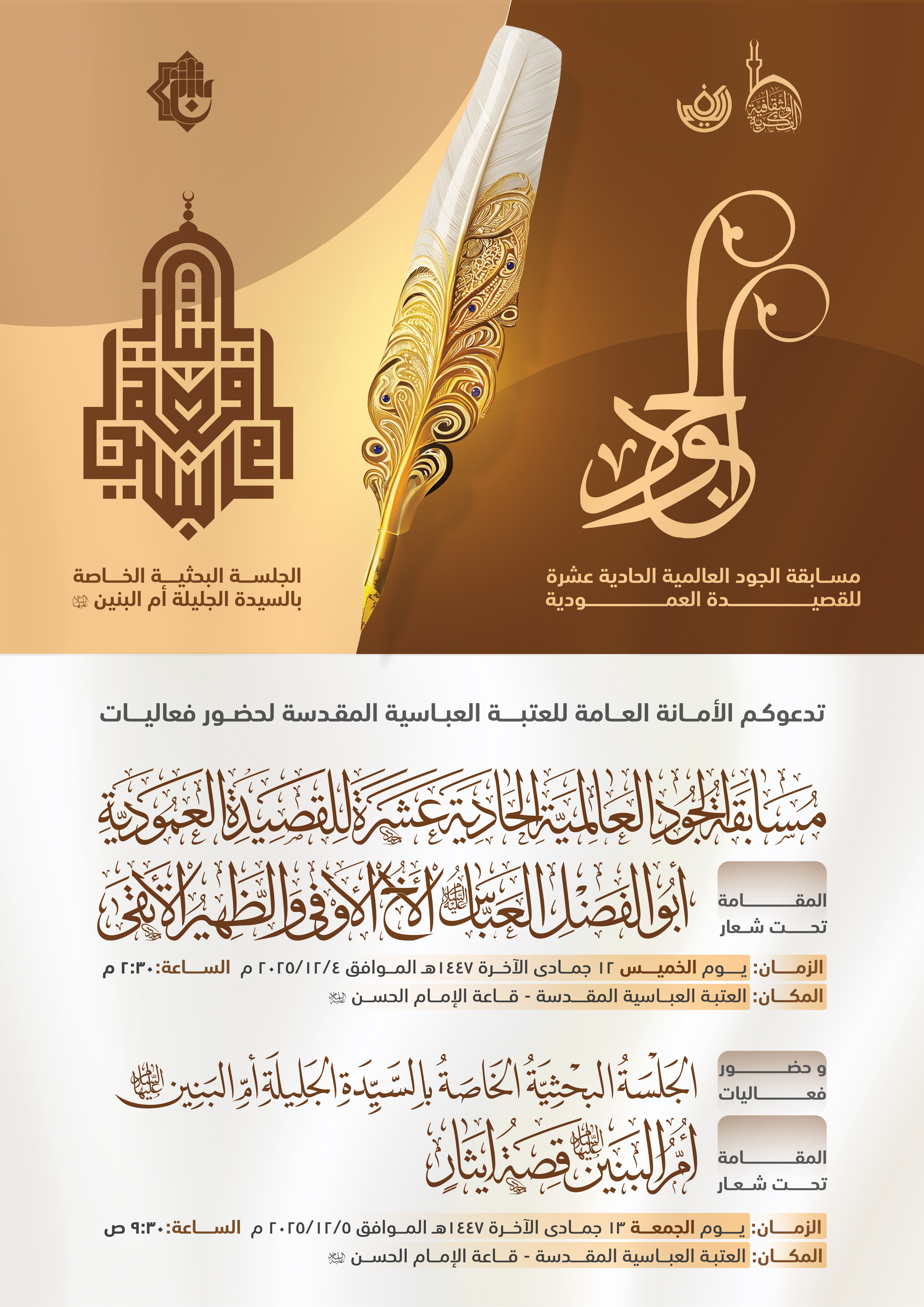وقال رئيس القسم، السيد عقيل الياسري: "تزامنًا مع ذكرى وفاة السيدة الجليلة أمّ البنين (عليها السلام)، يقيم القسم فعاليات النسخة الحادية عشرة من مسابقة الجود العالمية للقصيدة العمودية، تحت شعار (أبي الفضل العبّاس -عليه السلام- الأخ الأوفى والظهير الأتقى)".