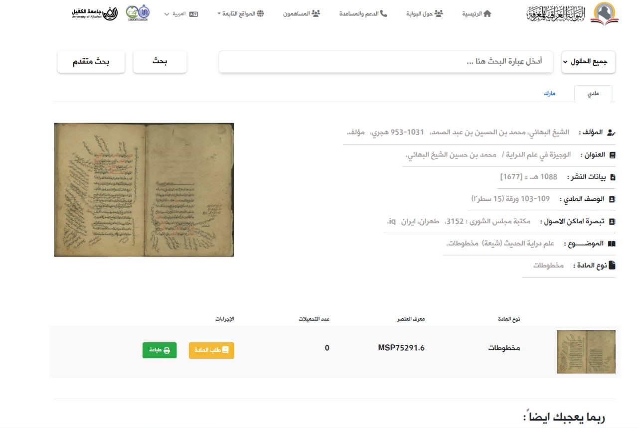 تواصل البوابة العراقية للمعرفة ترسيخ حضورها كإحدى أبرز المنصّات الوطنية المتخصصة بتنظيم المحتوى المعرفي العراقي وإتاحته، من خلال اعتمادها أحدث المعايير الدولية في الفهرسة، وفي مقدمتها قواعد وصف المصادر وإتاحتها (RDA) التي تُعد الإطار الأكثر حداثة ودقة في وصف البيانات الببليوغرافية، ولا سيما في مجال المخطوطات.