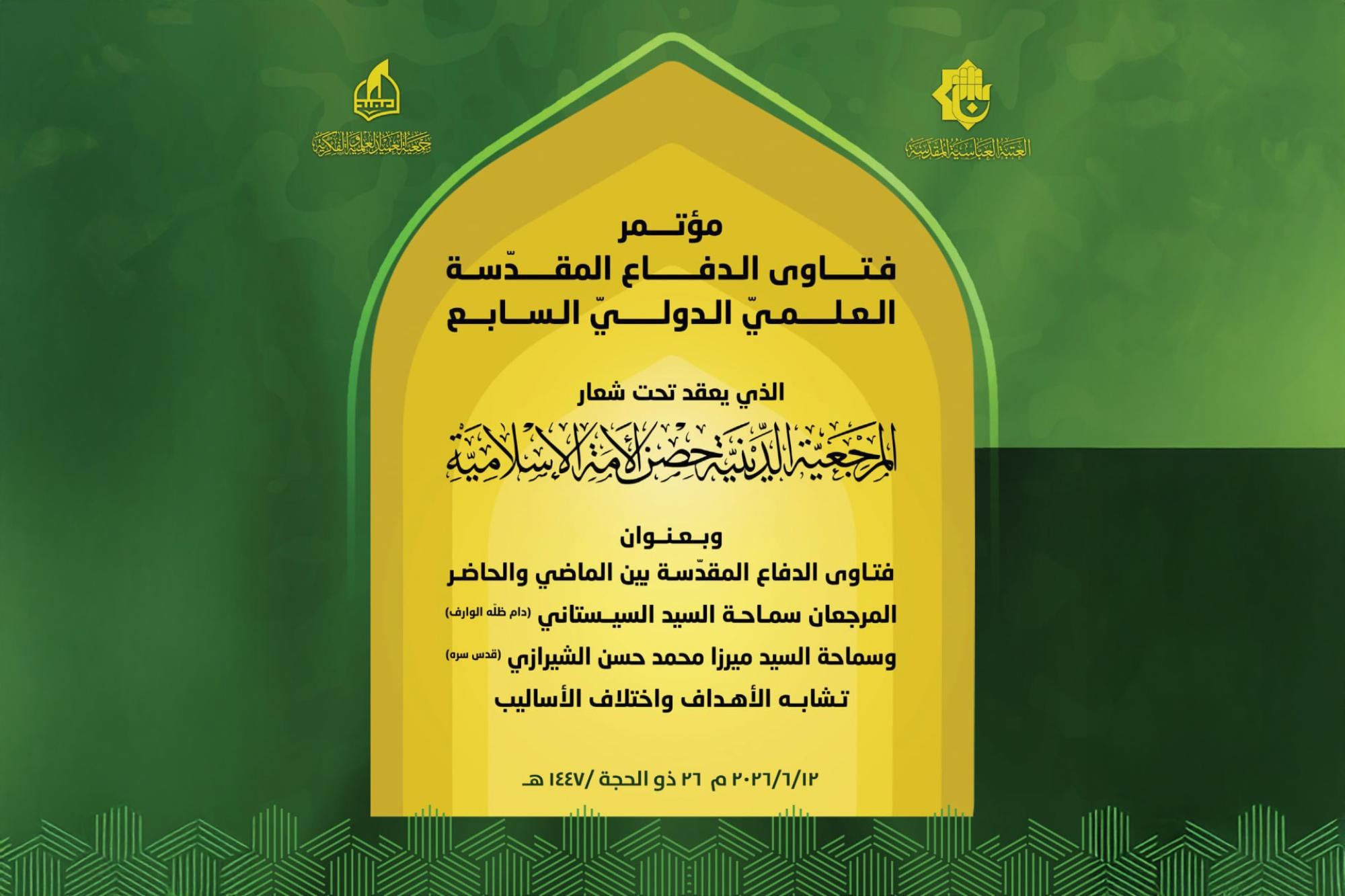 ويقام المؤتمر برعاية العتبة العباسية المقدسة، تحت شعار: (المرجعية الدينية حصن الأمة الإسلامية)، وبعنوان: (فتاوى الدفاع المقدسة بين الماضي والحاضر المرجعان سمـاحة السيد السيستاني -دام ظله الوارف- وسمـاحة السيد ميرزا محمد حسن الشيرازي (قدس سره) تشابه الأهداف واختلاف الأساليب) بالتعاون مع جامعتي الكفيل والعميد وجامعة كربلاء -كلية التربية للعلوم الإنسانية وكلية الإمام الكاظم (عليه السلام)/ أقسام ذي قار، ومركز العميد الدولي للبحوث والدراسات، وذلك في تاريخ 12/ 6/ 2026 الموافق 26 ذي الحجة/ 1447هـ.