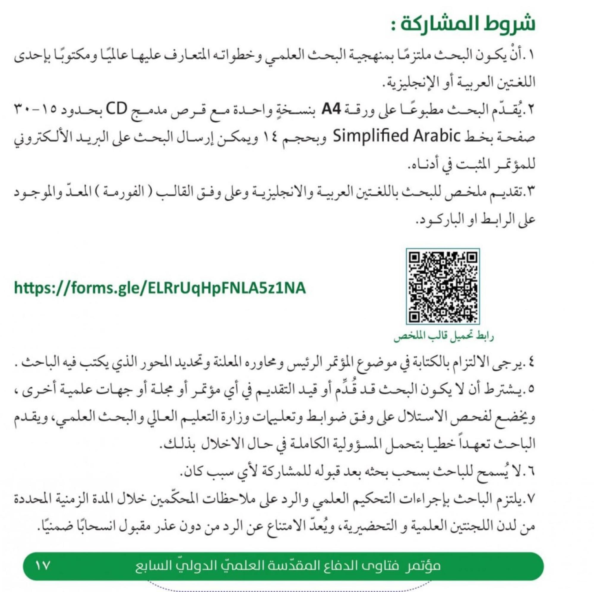 3- تقديم ملخص للبحث باللغتين العربية والإنجليزية على وَفقِ القالب (الفورمة) المعدّ والموجود على الرابط أو الباركود.