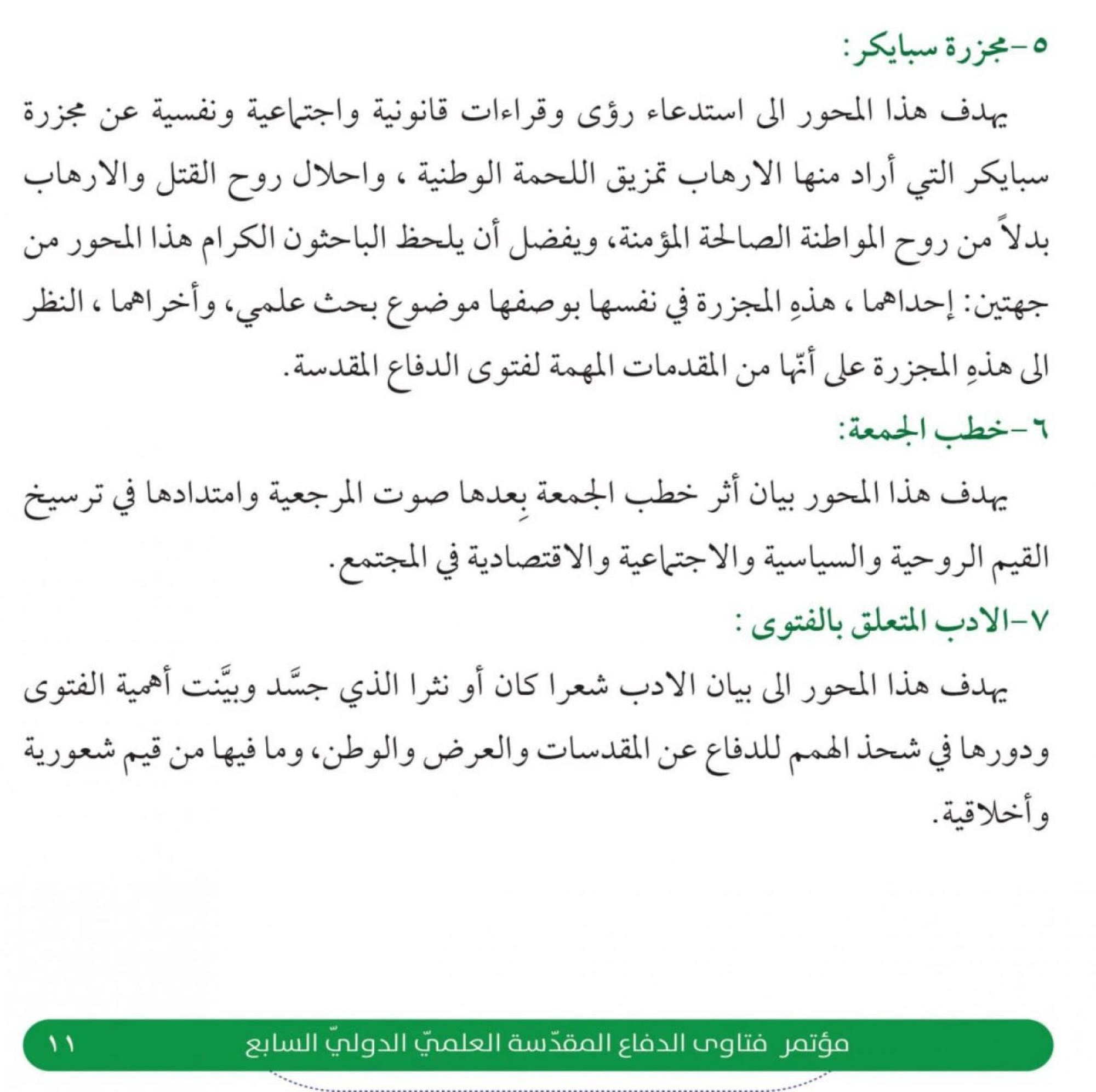 7- الأدب المتعلق بالفتوى: يهدف هذا المحور إلى بيان الأدب شعرًا كان أو نثرًا الذي جسّد وبيّن أهمية الفتوى ودورها في شحذ الهمم للدفاع عن المقدسات والعرض والوطن، وما فيها من قيم شعورية وأخلاقية.