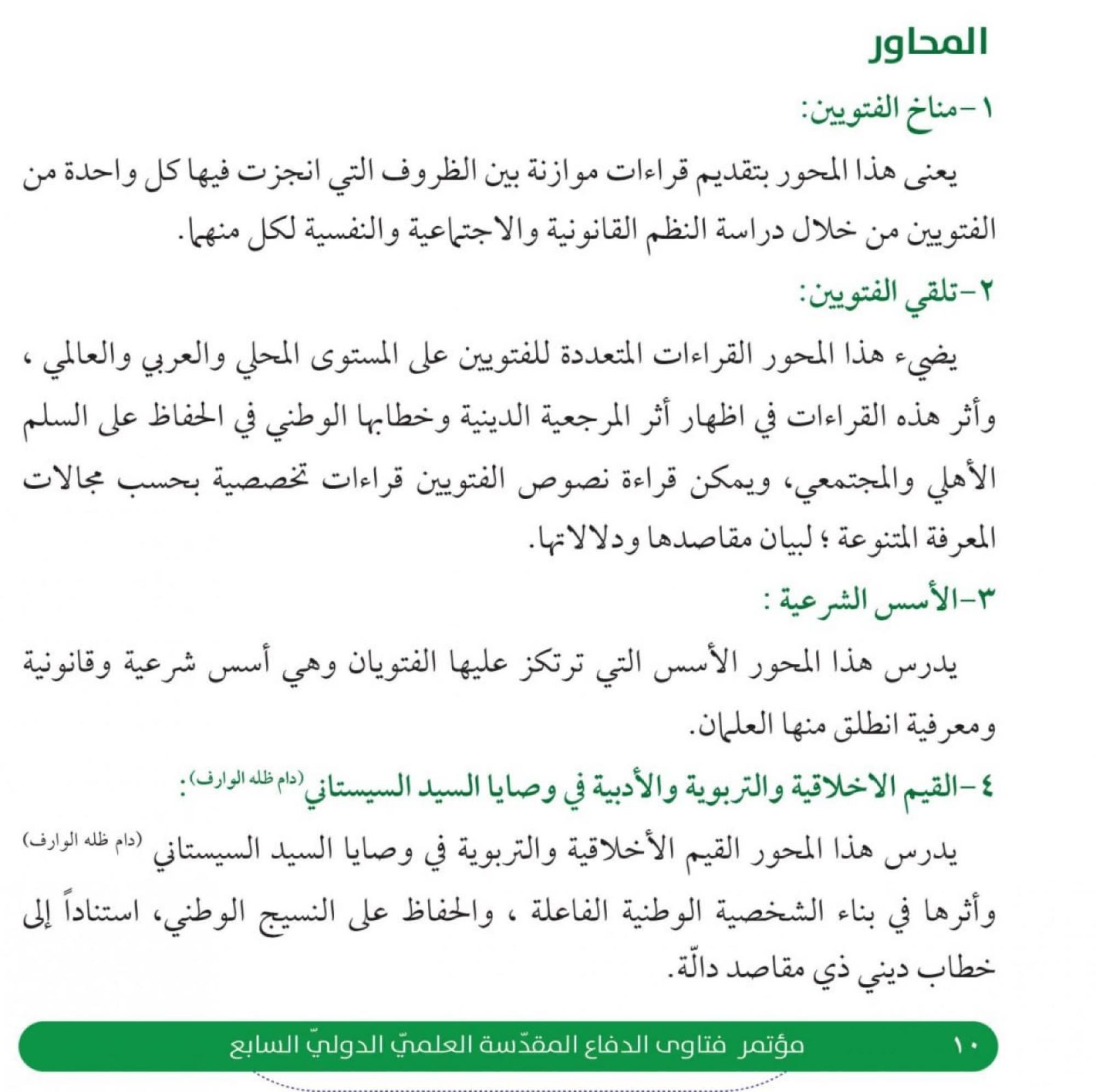 2-تلقي الفتويين: يضيء هذا المحور القراءات المتعددة للفتويين على المستوى المحلي والعربي والعالمي، وأثر هذه القراءات في إظهار أثر المرجعية الدينية وخطابها الوطني في الحفاظ على السلم الأهلي والمجتمعي، ويمكن قراءة نصوص الفتويين قراءات تخصصية بحسب مجالات المعرفة المتنوعة؛ لبيان مقاصدها ودلالاتها.