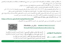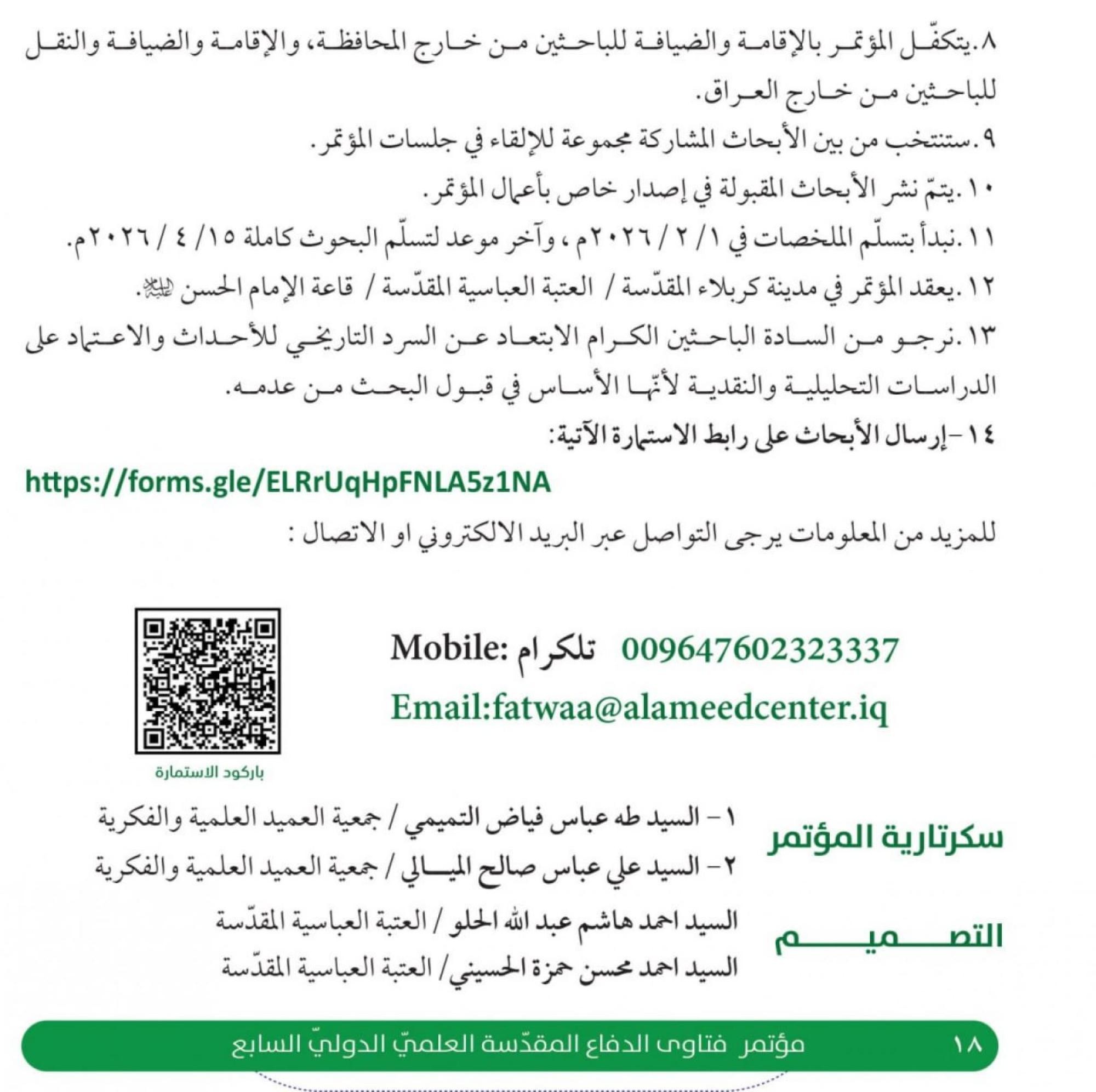 11- نبدأ باستلام الملخصات في 2/1 /2026م، وآخر موعد لاستلام البحوث كاملة 4/15 /2026م. ترسل البحوث عَبرَ رابط الاستمارة الإلكترونية: https://forms.gle/ELRrUqHpFNLA5z1NA للاستفسار والمزيد من المعلومات يرجى التواصل عَبرَ البريد الإلكتروني أو الاتصال: Email: fatwaa@alameedcenter.iq009647602323337Mobile: