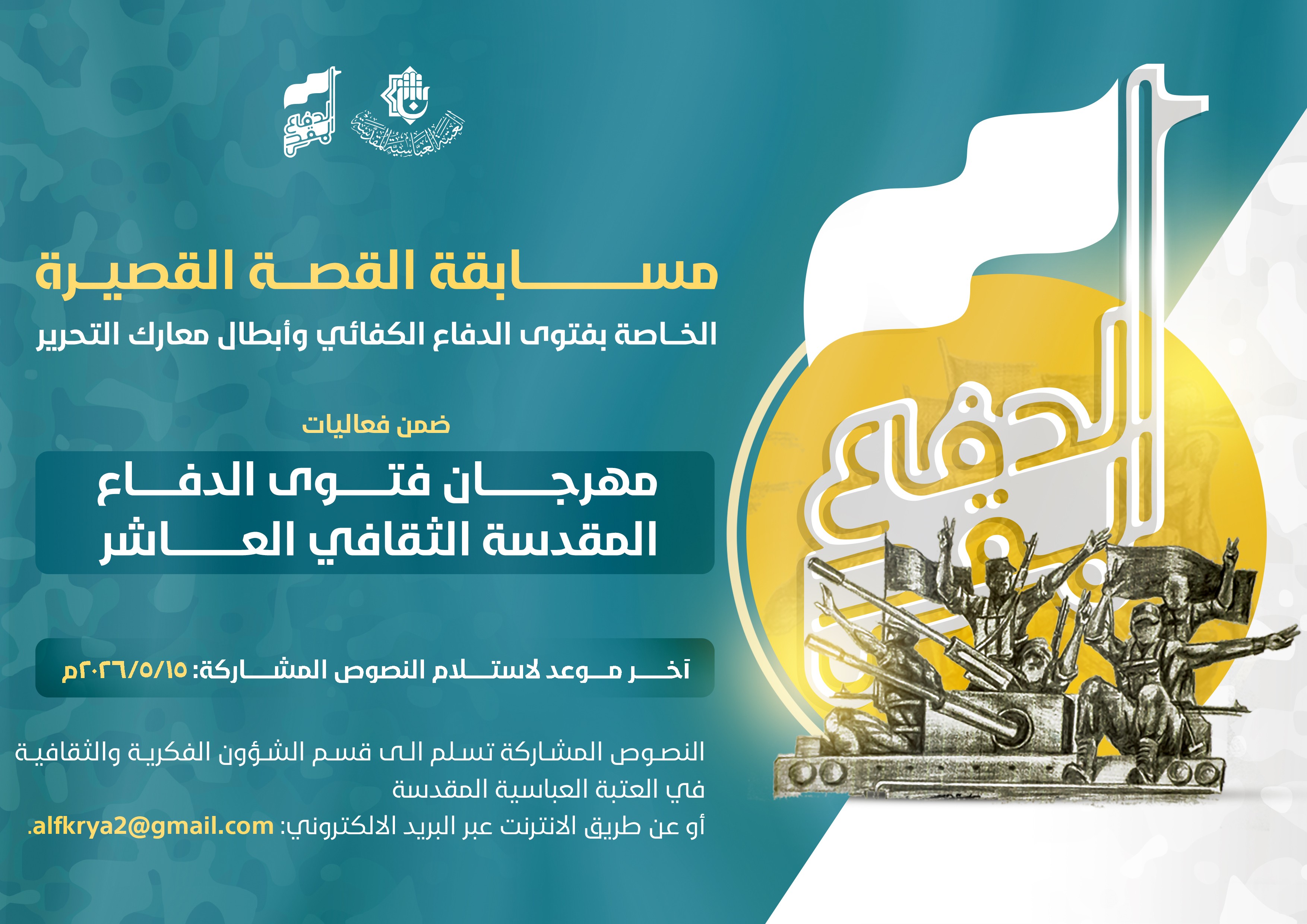 <strong>أعلنت اللجنة التحضيرية لمهرجان فتوى الدفاع المقدسة الثقافي عن إطلاق مسابقة القصة القصيرة، ضمن فعاليات الدورة العاشرة من المهرجان.</strong> <strong>وتأتي هذه المسابقة لرفد الساحة الوثائقية والثقافية بكل ما يتصل بالفتوى المباركة، وما قدّمه أبطالها من صور حيّة للشجاعة والإباء في تحرير أراضي وطننا الحبيب من أيدي الدنس، لتكون شاهدًا حيًّا للأجيال القادمة.</strong> <strong>وسيُعقد المهرجان تحت شعار: &laquo;<span style="color:#2980b9">المرجعية الدينية حصن الأمة الإسلامية</span>&raquo;، وينظمه قسما الشؤون الفكرية والثقافية ومؤسسة الوافي للتوثيق والدراسات في العتبة العباسية المقدسة، وذلك خلال المدة من (<span style="color:#2980b9">11&ndash;12 / 6 / 2026م</span>).</strong> <strong>شروط المشاركة في المسابقة:&nbsp; 1- أن تكون القصّة محاكية لشعار المهرجان وأن تكون ضمن أبعاده. 2- أن تتناول القصّة بطولات الجيش العراقي والحشد الشعبي بشكل عام دون التخصيص لجهة معينة في الدفاع عن الوطن والقيم الإنسانيّة والحضاريّة والمقدّسات. 3- ألّا تكون القصّة منشورة سابقاً، وغير مشاركة في مسابقة أخرى. 4- تُسلَّم المشاركات على قرص ليزري إلى قسم الشؤون الفكريّة والثقافيّة في العتبة العبّاسيّة المقدّسة مرفقة مع السرة الذاتية للكاتب، أو ترسل على المعرف التالي: <span style="color:#2980b9">alfkrya11@</span>، أو عبر البريد الالكتروني:&nbsp;<span style="color:#2980b9">alfkrya2@gmail.com&nbsp;</span> 5- يبدأ استلام المشاركات اعتباراً من (10/ 1/ 2026م) ولغاية (15/ 5/ 2026م). 6- ألا تقل القصّة عن (٧٠٠) كلمة. 7- للتواصل حول المسابقة الاتصال على الرقم: <span style="color:#2980b9">(07718731818)</span>. 8- ارسال السيرة الذاتيّة للمشارك في ملف (وورد) مع النص، متضمنة ما يلي: &nbsp; &nbsp; &nbsp; - الاسم الكامل. &nbsp; &nbsp; &nbsp; - مكان وتاريخ ميلاده الكامل. &nbsp; &nbsp; &nbsp; - عنوانه، ورقم هاتفه، والبريد الإلكتروني. &nbsp; &nbsp; &nbsp; - التحصيل الدراسي. 9- تستبعد المشاركات التي لا تلتزم بالشروط الواردة أعلاه من الاشراك في المسابقة. 10- كل القصّص المشاركة سواء الفائزة أو تلك التي لم يحالفها الحظ لا تعاد لأصحابها، ويحق للّجنة التحضيرية الاحتفاظ بها. جوائز المسابقة: &bull;&nbsp;&nbsp; &nbsp;الفائز الأول: (750,000) دينار &bull;&nbsp;&nbsp; &nbsp;الفائز الثاني: (500,000) دينار &bull;&nbsp;&nbsp; &nbsp;الفائز الثالث: (400,000) دينار &bull;&nbsp;&nbsp; &nbsp;من الرابع إلى العاشر: (300,000) دينار</strong> &nbsp;