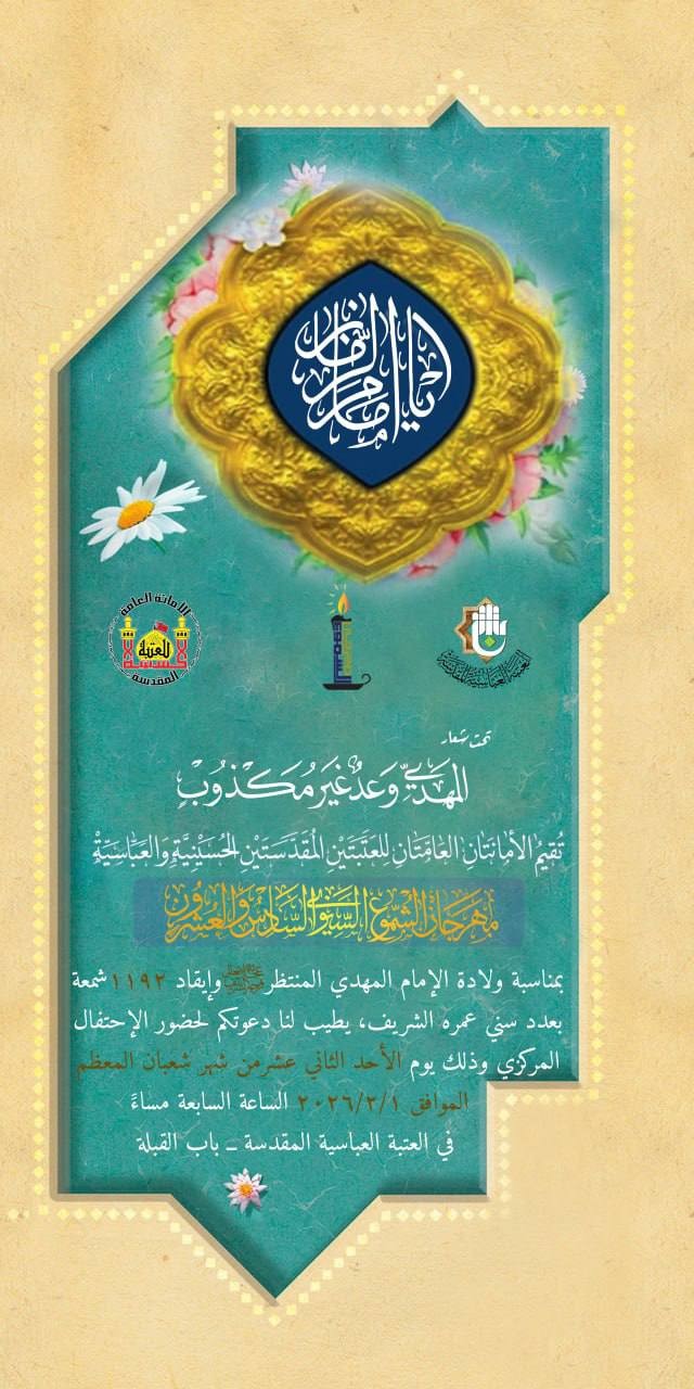 ويُقام المهرجان في باب القبلة لمرقد أبي الفضل العباس (عليه السلام)، تحت شعار (المهديُّ وعدٌ غيرُ مكذوب)، يوم الأحد الموافق 1 / 3 / 2026م، في تمام الساعة السابعة مساءً.
