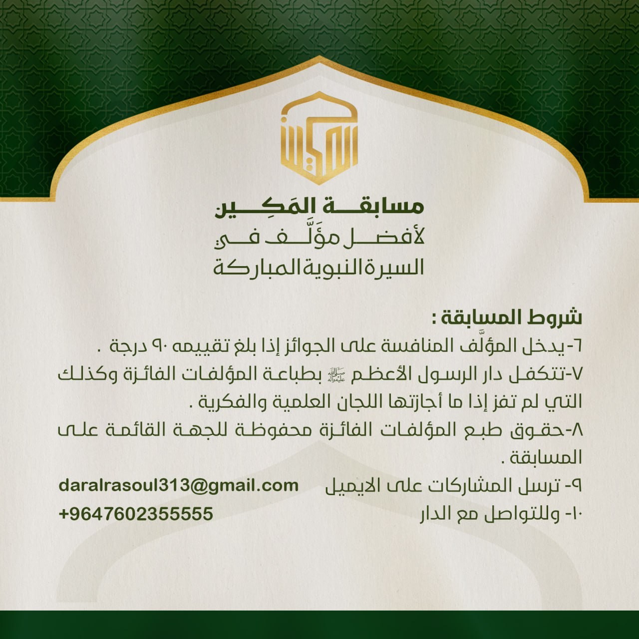 9- ترسل المشاركات عبر البريد الإلكتروني: daralrasoul313@gmail.com