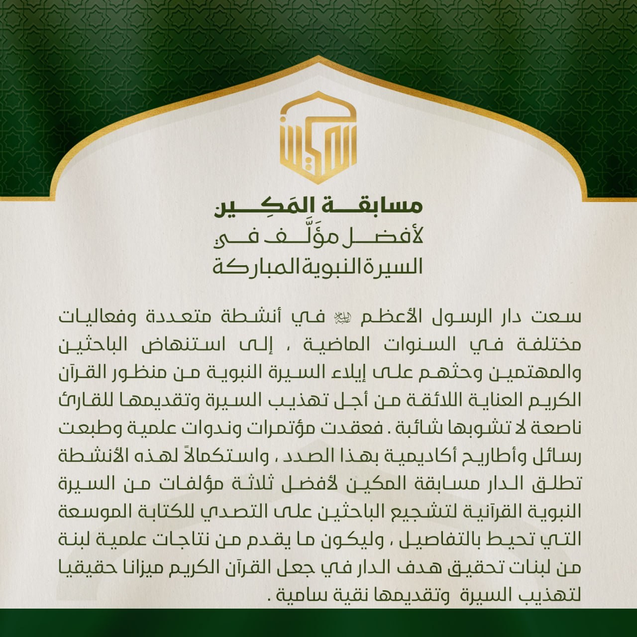 وتُعدّ هذه المسابقة الثانية ضمن مسابقات الدار الخاصة بالسيرة النبوية، في إطار سعيها الحثيث إلى تشجيع الأقلام البحثية الجادّة على الخوض العلمي الرصين في السيرة النبوية وأدبياتها، وما يتصل بها من موضوعات فكرية وثقافية.