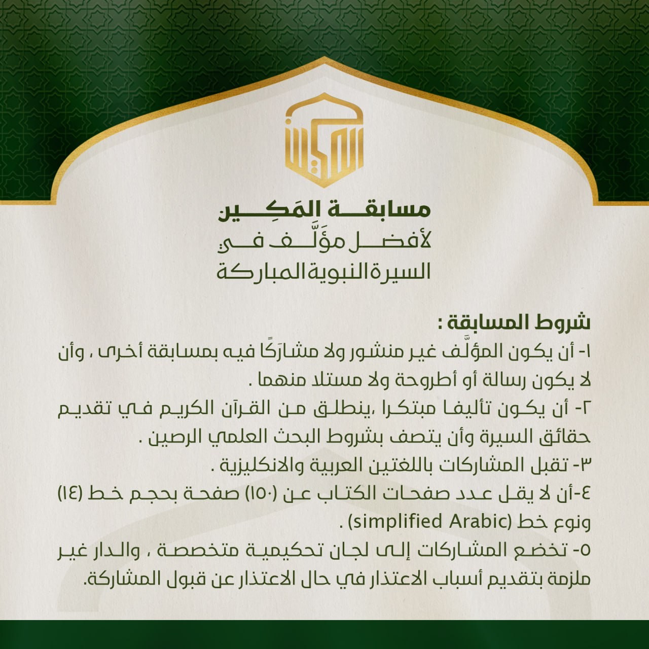 2- أن يكون العمل تأليفًا مبتكرًا ينطلق من القرآن الكريم في تقديم حقائق السيرة النبوية، ومتّصفًا بشروط البحث العلمي الرصين.