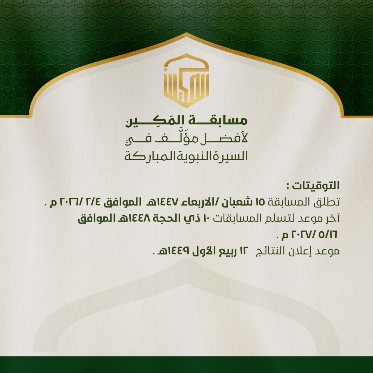 1- إطلاق المسابقة: يوم الأربعاء (15 شعبان 1447هـ) الموافق (4/ 2/ 2026م).