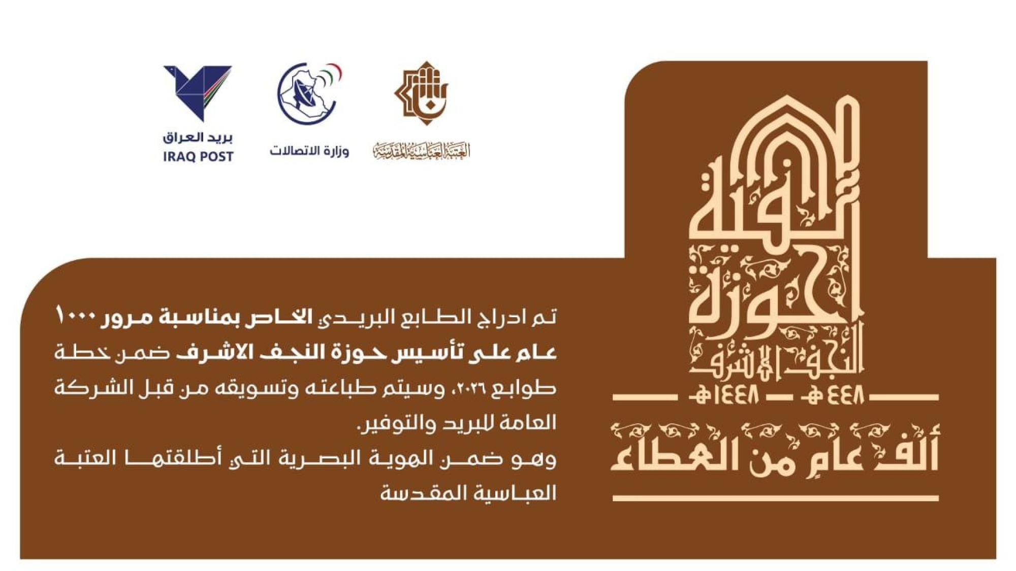 أدرجت وزارة الاتصالات العراقية الطابع البريدي الخاص بمناسبة مرور 1000 عام على تأسيس حوزة النجف الأشرف، ضمن خطة طوابع العام 2026م.