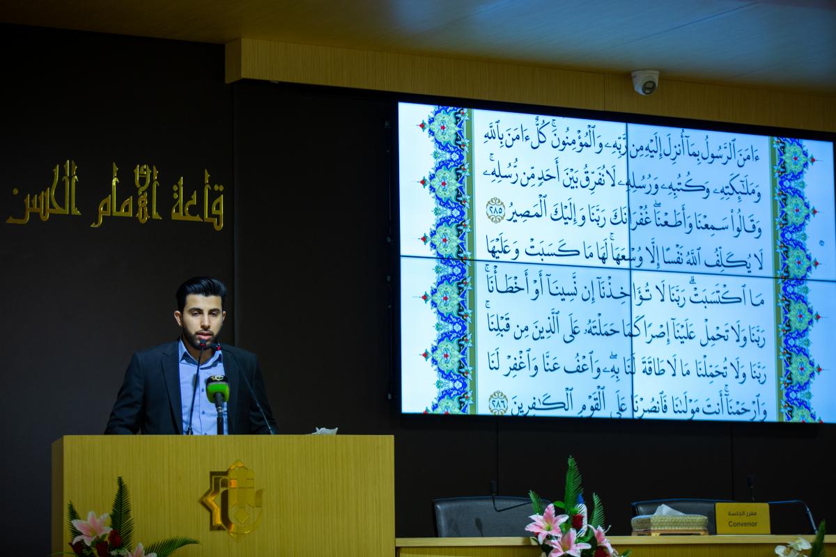 <p dir="RTL" style="margin-left:0in; margin-right:0in; text-align:justify"><span style="font-size:11pt"><span style="font-family:Calibri,"sans-serif""><span style="font-size:18.0pt"><span style="font-family:"Arial","sans-serif"">واستُهِلّ افتتاحُ المُلتقى بتلاوة آياتٍ من الذكر الحكيم من ثمّ قراءة سورة الفاتحة ترحّماً على أرواح شهداء العراق، أعقب ذلك الاستماع للنشيد الوطنيّ وأنشودة العتبة العباسية المقدّسة (لحن الإباء).</span></span></span></span></p>