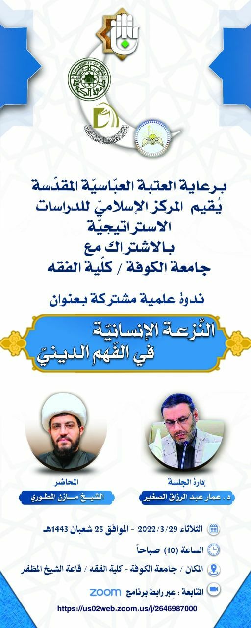 <p dir="RTL" style="margin-left:0in; margin-right:0in; text-align:right"><span style="font-size:14pt"><span style="font-family:Arial,"><strong><span style="font-size:16.0pt">عقَدَ المركزُ الإسلاميّ للدّراسات الاستراتيجيّة التابع لقسم الشؤون الفكريّة والثقافيّة في العتبة العبّاسية المقدّسة، بالاشتراك مع كلّية الفقه في جامعة الكوفة، ندوةً علميّة تحت عنوان: (النَّزعـة الإنسـانيّة في الفَـهم الـدينيّ) قدّمها الشيخ مازن المطوري.</span></strong></span></span></p>