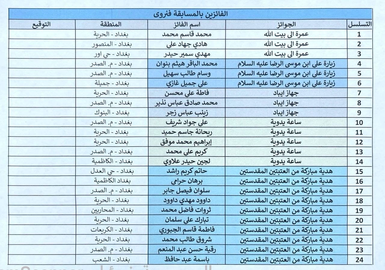 أعلن مركز ملتقى القمر الثقافي التابع لقسم الشؤون الفكرية والثقافية في العتبة العباسية المقدسة عن أسماء الفائزين في مسابقة "فنروى" الثقافية، التي أُقيمت بالتعاون مع مركز ارتقاء للتنمية المجتمعية.