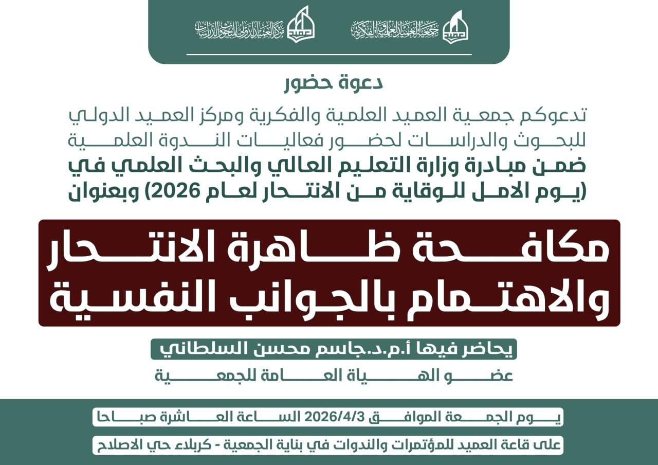 أعلنت جمعيّة العميد العلميّة والفكريّة عن إطلاق فعاليّات ندوتها العلميّة الموسومة: "مكافحة ظاهرة الانتحار والاهتمام بالجوانب النفسية"، وذلك ضمن مبادرة وزارة التعليم العالي والبحث العلمي في يوم الأمل للوقاية من الانتحار لعام 2026م.